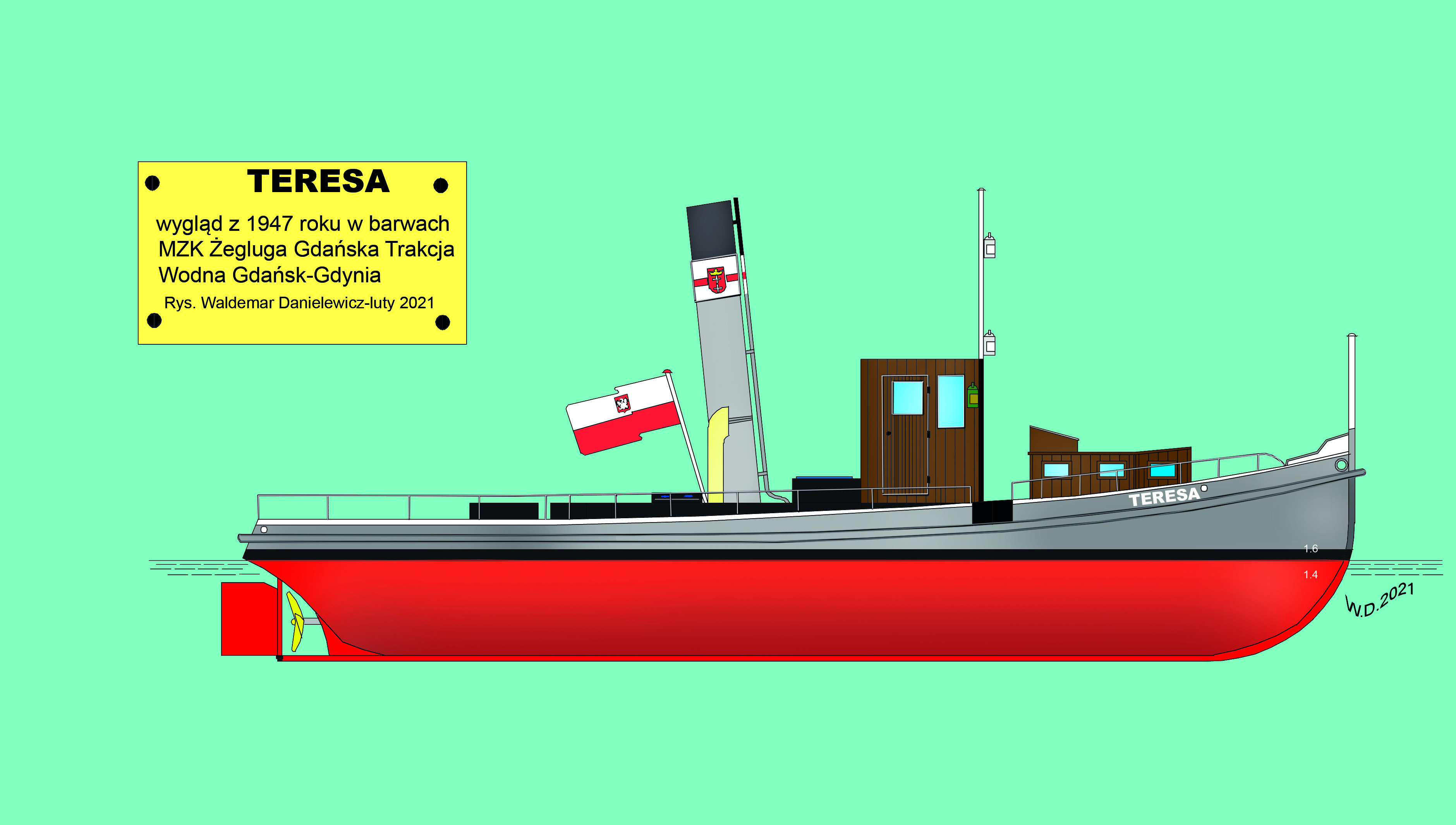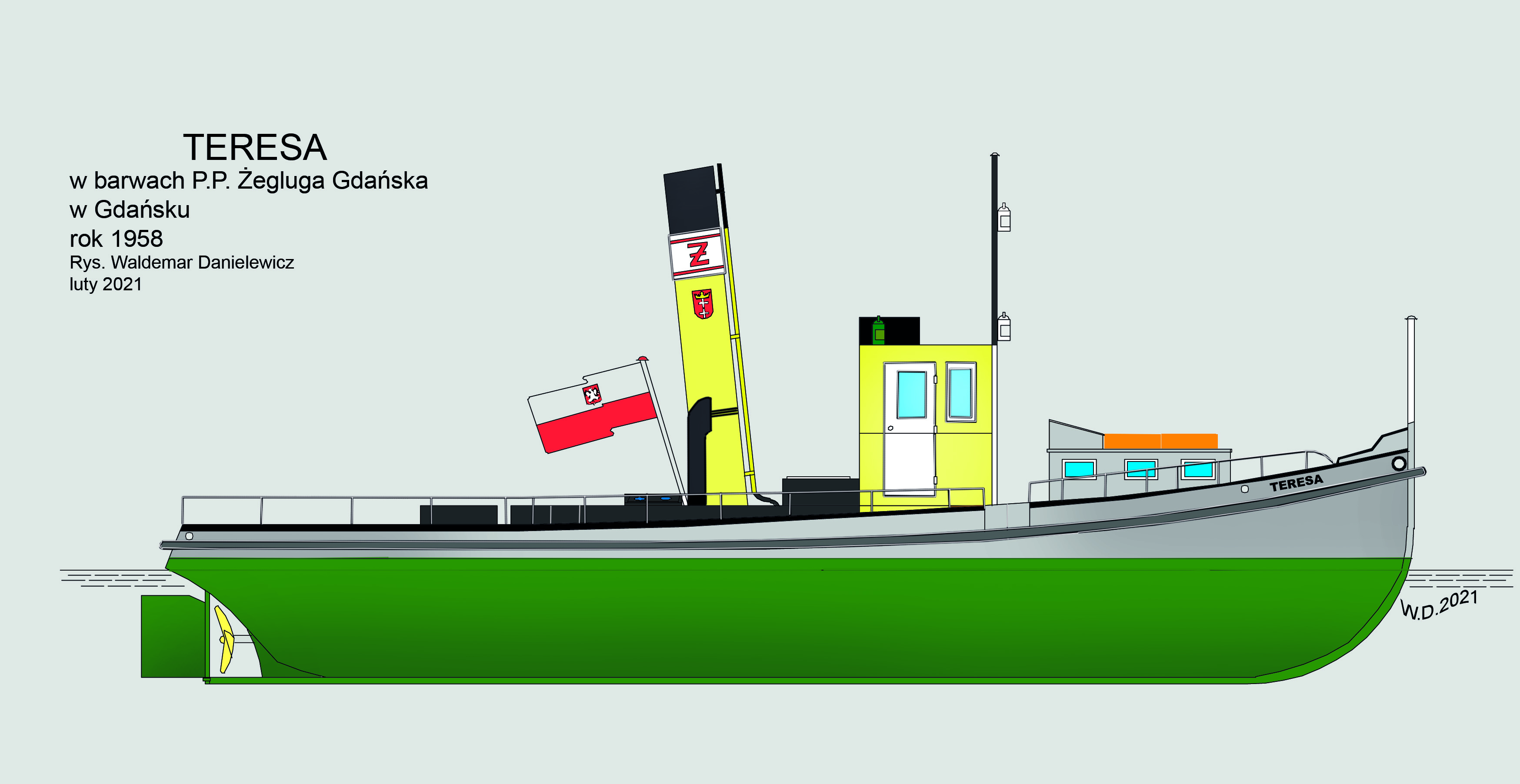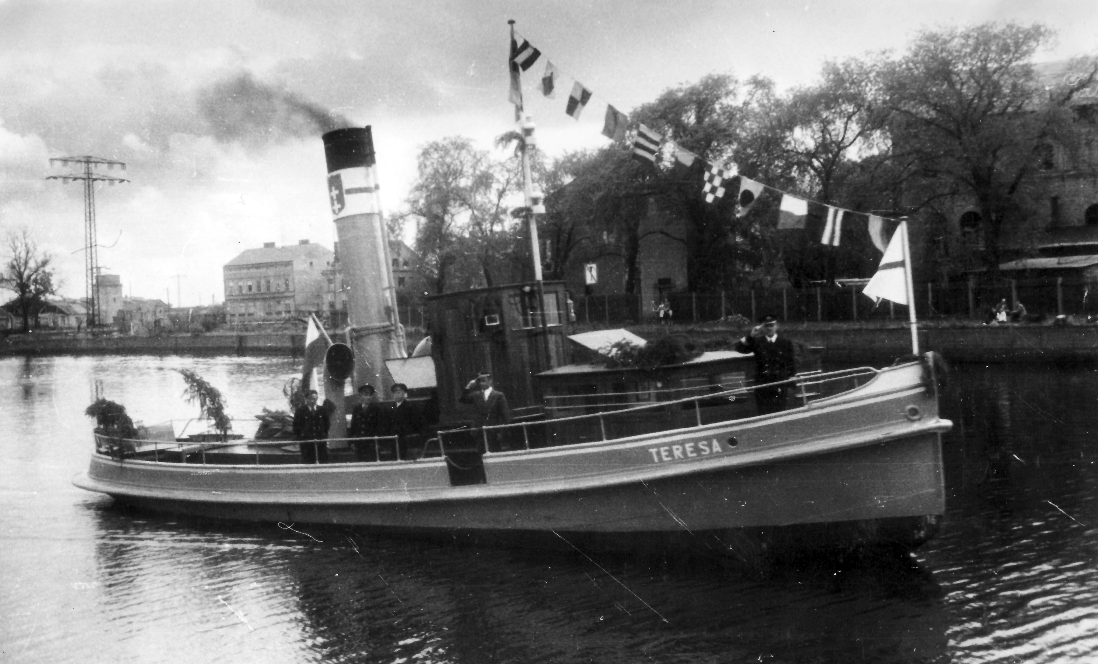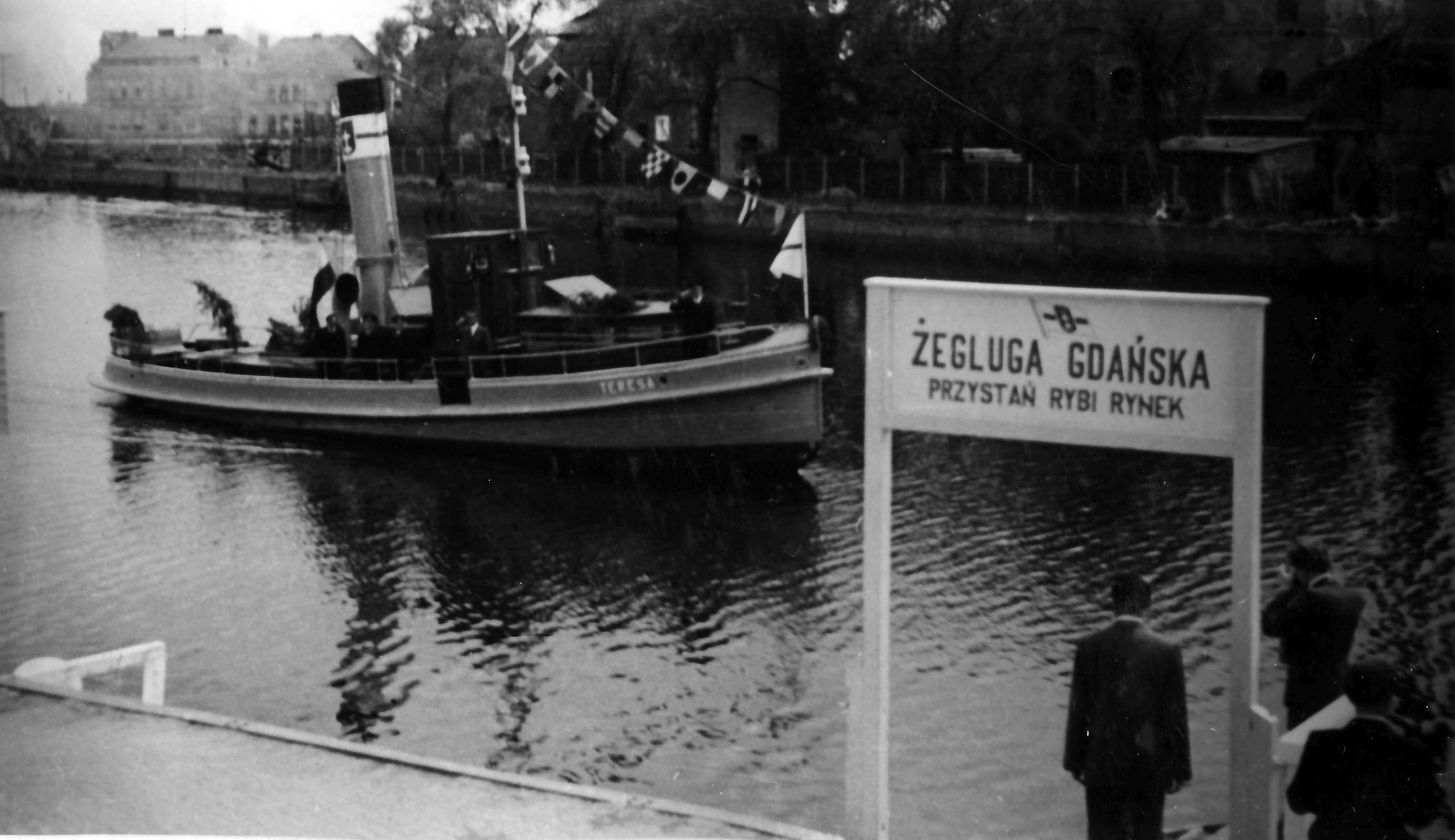 Zbudowany jako holownik pożarowo-ratowniczy dla Kaiserlische Werft w Gdańsku, otrzymał nazwę „HILFE”. Posiadał na wyposażeniu działko wodne. W 1919 roku, kiedy to Stocznia Cesarska ulegała likwidacji, holownik przejęła nowo powstała Danziger Werft, która w 1920 roku odsprzedała go miastu Gdańsk. Podlegał on organizacyjnie pod Magistrat Miasta. W 1923 roku przekazano go nowopowstałemu przedsiębiorstwu Danziger Stadische Fähren czyli Gdańskie Promy Miejskie. W gdańskiej stoczni J. W. Klawitter Werftbetriebsgesellschaft m.b.H. dokonano przebudowy na prom parowy do komunikacji wodnej. Otrzymał nową maszynę parową o mocy 120 KM. Po remoncie służył jako prom rezerwowy. W latach 1933-1935 pływał jako prom przez Wisłę na trasie: Letzkau – Schönenberg czyli Leszkowy – Ostaszewo. W międzyczasie w 1934 roku otrzymał nowy kocioł parowy. W marcu 1945 roku „HILFE” został celowo uszkodzony i zatopiony na Motławie w pobliżu Fischmarkt [dz. Targ Rybny]. Wrak przejęty przez Zjednoczenie Przedsiębiorstw Portowych. Wydobyty z wody 20 października 1945 r. i odholowany do remontu do ówczesnej Stoczni 4 w Gdańsku [dawna Wojan Werft]. W grudniu tego samego roku „HILFE” został przekazany Miejskim Zakładom Komunikacyjnym, które w marcu 1946 r. utworzyło Żeglugę Gdańską – Miejskie Zakłady Komunikacyjne Trakcja Wodna Gdańsk-Gdynia. Nazwany „TERESA” wszedł do eksploatacji 20 marca 1946 roku na linię Rybi Rynek, jak wówczas nazywany był Targ Rybny, do nabrzeża przy Kapitanacie Portu w Gdańsku Nowym Porcie. Kapitanem statku został Aleksander Strąk. Statek mógł zabrać na pokład 30 pasażerów. 16 lipca 1947 roku manewrujący w porcie gdańskim holownik „CYKLOP” uderzył w stojącą przy nabrzeżu Kapitanatu „TERESĘ” uszkadzając jej burtę. Po remoncie statek wrócił na stałą linię, jego zużycie oceniano na 50%. Od 1948 roku „TERESĘ” skierowano na linię: Gdańsk Targ Rybny – Bosmanat Portu Motława – Przeróbka – Stogi – Krakowiec – Górki Zachodnie – Górki Wschodnie – Sobieszewo. W dniu 1 lutego 1949 roku około godziny 17:45 „TERESA” wracając z Sobieszewa wpłynęła do kanału śluzy w Pleniewie [dz. Płonia] z pełną prędkością i najechała na brzeg, doznając silnego przechyłu, tak że woda dostała się na pokład. Przerażeni pasażerowie zaczęli skakać na ląd, przy czym dwóch z nich wpadło do wody. Po zejściu z brzegu kapitan kontynuował rejs, a dobijając do przystani w Górkach Zachodnich uderzył w nią niszcząc ¾ drewnianej przystani, po czym płynąc do Gdańska koło Krakowskiej Kępy zboczył z nurtu i osiadł na mieliźnie. Na pomoc wysłano holownik „KSIĘŻAK” z Dyrekcji Dróg Wodnych w Gdańsku, który ściągnął „TERESĘ” z mielizny i przyholował na Stogi. Jak się okazało kapitan oraz maszynista Alojzy Wawrocki i marynarz Stanisław Połczyński byli pijani. Nowym kapitanem statku został Franciszek Cieślicki. Po likwidacji Żeglugi Gdańskiej statek przejęła Żegluga Przybrzeżna w Gdańsku kierując statek do Gdyni gdzie pływał w ruchu wycieczkowym. Pod koniec roku kapitanem statku został Jan Kempa, a zużycie kadłuba oceniano na 70%. W 1950 roku kapitanami statku byli na zmianę Edward Rydlewski i Feliks Osiński, maszynistami Stanisław Godlewski i Tadeusz Gala oraz palaczami Stanisław Przywara, Zdzisław Kowalkowski i Henryk Maczugowski. Od 1953 roku w Polskiej Żegludze Przybrzeżnej w Gdańsku pozostając nadal w Gdyni. Rok 1956 przyniósł kolejną zmianę armatora, którym została Bydgoska Żegluga na Wiśle w Bydgoszczy Ekspozytura Gdańsk-Gdynia, statek powrócił do Gdańska gdzie pływał po porcie. W 1957 roku „TERESA” trafiła do P.P. Żegluga Gdańska w Gdańsku, gdzie pływała do końca sezonu 1958 roku, po czym została wycofana. Złomowana w 1962 roku. © Opracował Waldemar Danielewicz – 24.09.2023 |