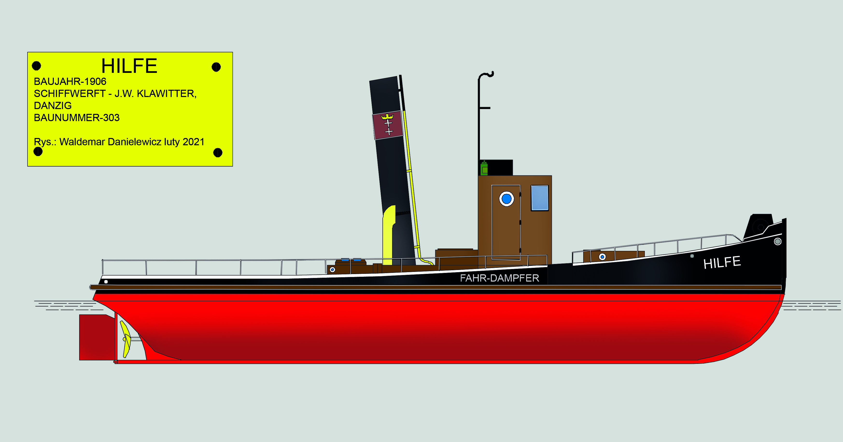 POPRZEDNIE NAZWY: ex HILFE. TYP STATKU: pasażerski parowy śrubowy. ROK I MIEJSCE BUDOWY: 1906, J. W. Klawitter Werft GmbH, Danzig [Niemcy]. STOCZNIOWY NUMER BUDOWY: 303. WYMIARY: długość całkowita 18,44 m, długość między pionami 17,16 m, szerokość całkowita 4,32 m, szerokość na wręgach 4,05 m, wysokość burt 1,70 m, zanurzenie 1,51 m, pojemność brutto 33 BRT, pojemność netto 17 NRT. SILNIKI GŁÓWNE: 1 maszyna parowa podwójnego rozprężania, 2-cylindrowa, moc 100 KM, producent: J. W. Klawitter Werft GmbH, Danzig; ↓ 1 maszyna parowa stojąca podwójnego rozprężania systemu Compound, 2-cylindrowa, moc 120 KM, średnice cylindrów 243/410 mm, skok tłoka 250 mm, rok produkcji 1924, producent: J. W. Klawitter Werft GmbH, Danzig. KOCIOŁ PAROWY: 1 kocioł szkocki, ciśnienie robocze 10 at, powierzchnia ogrzewalna 46,25 m2, rok budowy 1933, numer fabryczny 730, producent: Klawitter Werft-Betrieb GmbH u. Co., Danzig. INNE DANE: materiał: dno: stal, burty: stal, pokład: stal, kadłub nitowany o poprzecznym układzie wiązań, pędnik: 1 śruba, prędkość 12 km/h, załoga 4 osoby, 30 pasażerów. ARMATOR: P.P. Żegluga Gdańska w Gdańsku. PORT MACIERZYSTY: Gdańsk. SYGNAŁ WYWOŁAWCZY: SOCQ. NUMER PRS: 12010.