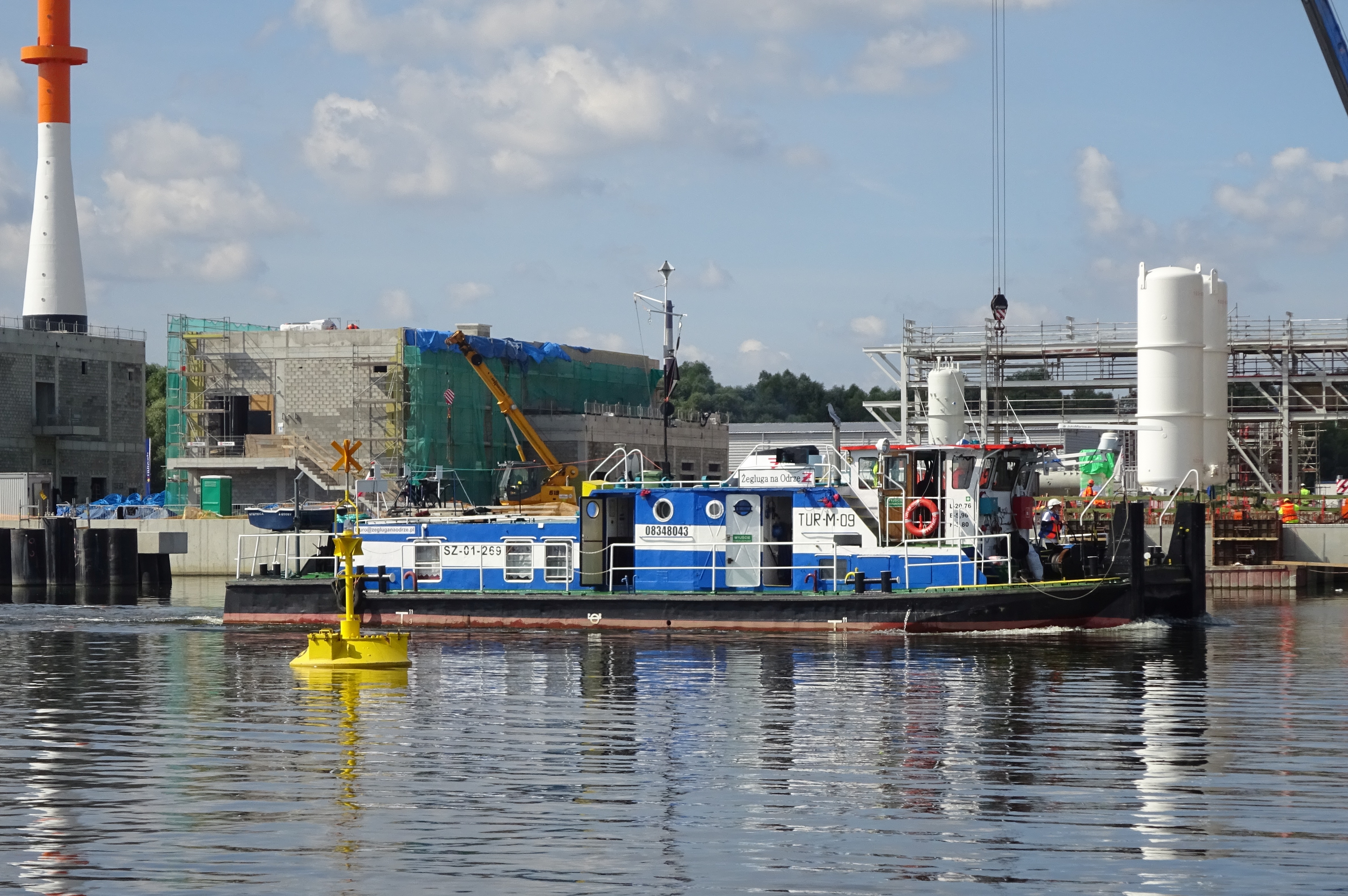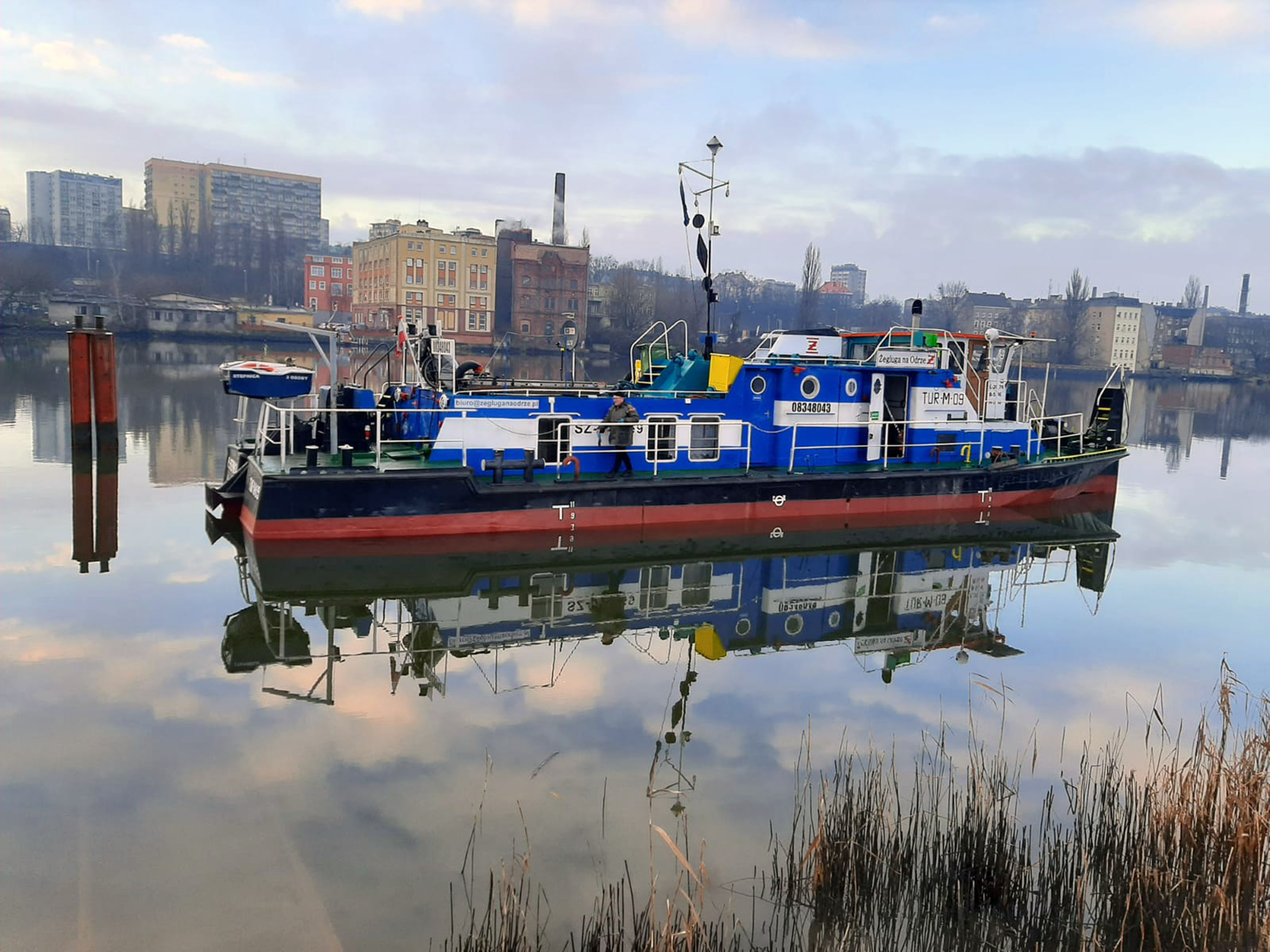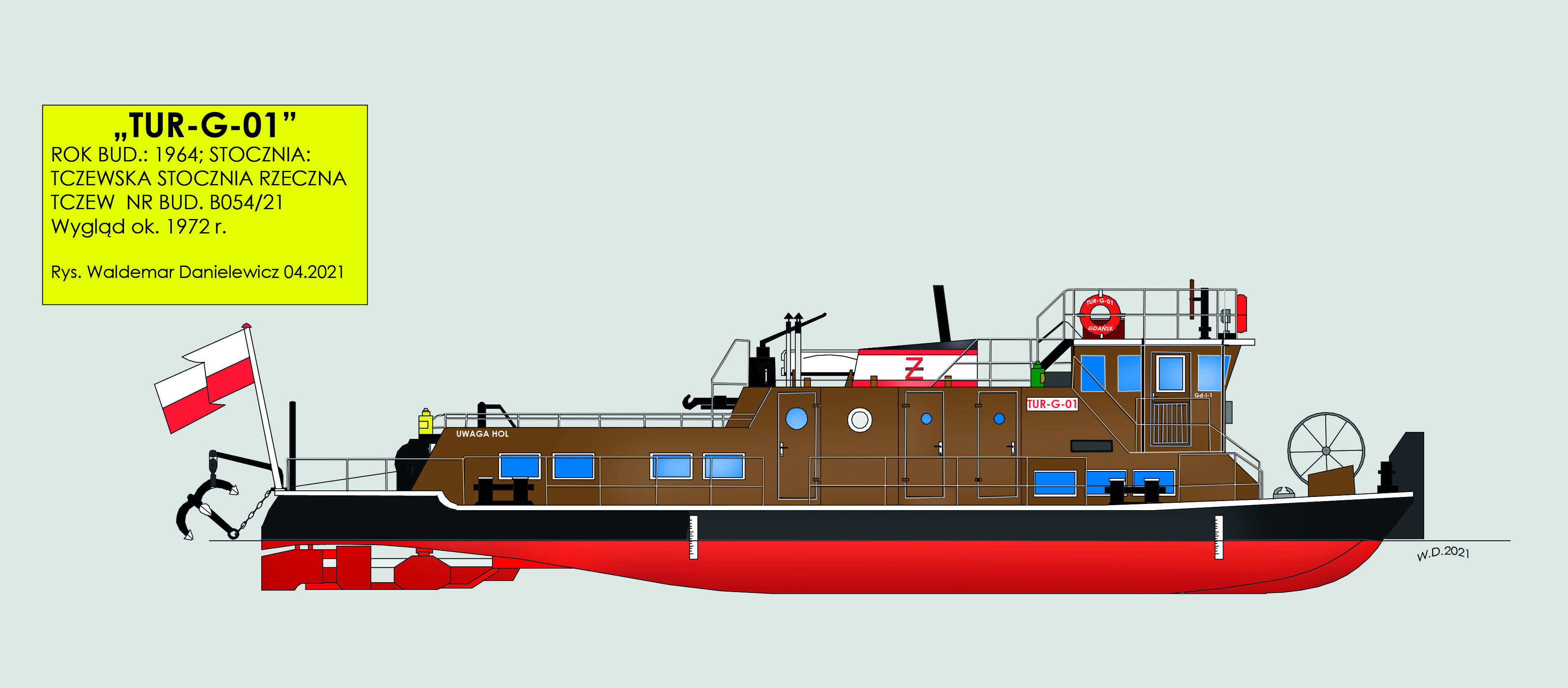 Stępkę pod seryjny pchacz typu Tur I położono w czerwcu 1963 roku, otrzymał on stoczniowy numer budowy B054T/21. Podczas wodowania otrzymał nazwę „TUR-O-26”, ponieważ był przeznaczony dla P.P. Żegluga na Odrze we Wrocławiu. Tuż przed oddaniem przez stocznię nowego pchacza zapadła w Zjednoczeniu Żeglugi Śródlądowej decyzja o przekazaniu statku P.P. Żegluga Gdańska w Gdańsku. Nowy armator nazwał pchacza „TUR-G-01”. Jeszcze przed przekazaniem jednostki armator wprowadził dodatkowo kilka istotnych zmian. Przede wszystkim zamontowano na nim hak holowniczy co spowodowało trochę zmian w sylwetce Tura. Pchacz wszedł do eksploatacji 3 września 1964 r. i zatrudniony był przy holowaniu barek na Dolnej Wiśle i w Delcie Żuław oraz przy pchaniu barek ze żwirem wydobywanym z dna Wisły w okolicach Grudziądza, Tczewa i Białej Góry. We wrześniu 1977 roku Żegluga Gdańska przekazała pchacz Żegludze Bydgoskiej. Po remoncie zmienił nazwę na „TUR-B-09” i port macierzysty na Bydgoszcz. W latach osiemdziesiątych XX w. pchacz przebudowano. Między innymi wymieniono silniki główne, zlikwidowano pomost pelengowy na nadbudówce, wymieniono windy spinające, a także zlikwidowano 2 kotwice czterołapowe na rufie montując jedną kotwicę patentową umieszczoną w kadłubie. Od 1995 roku w Żegluga Bydgoska S.A. We wrześniu 2009 roku sprzedany w ręce prywatne, czyli: Piotr Plewiński i Wiesław Kamiński [P.W. Kwant, Bydgoszcz]. Od 2016 roku armatorem statku jest Żegluga na Odrze Leszek Kiełtyka w Stepnicy. Pływa pod nazwą „TUR-M-09”. Port macierzysty Stepnica. W eksploatacji. © Opracował Waldemar Danielewicz – 25.04.2025 |