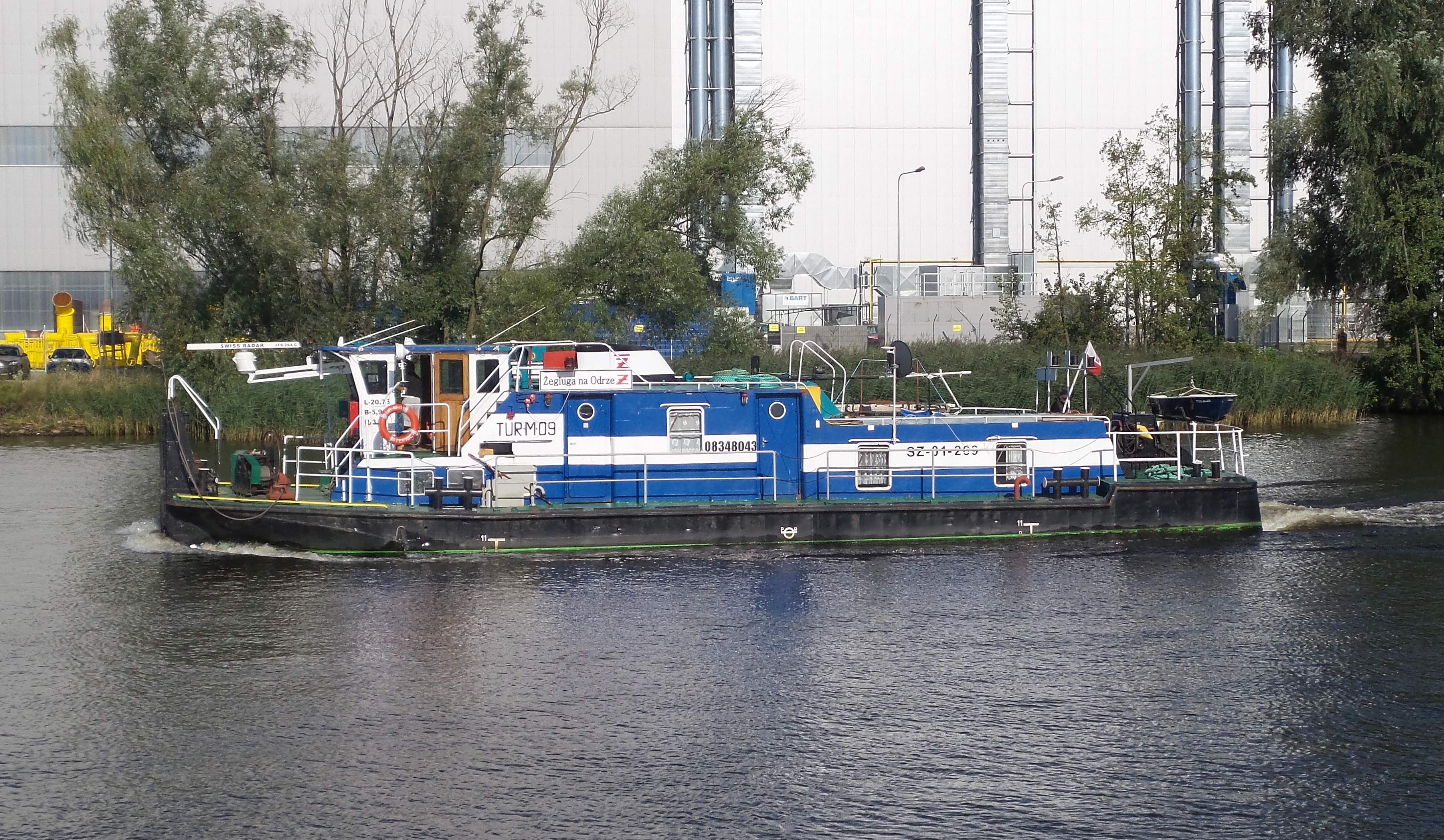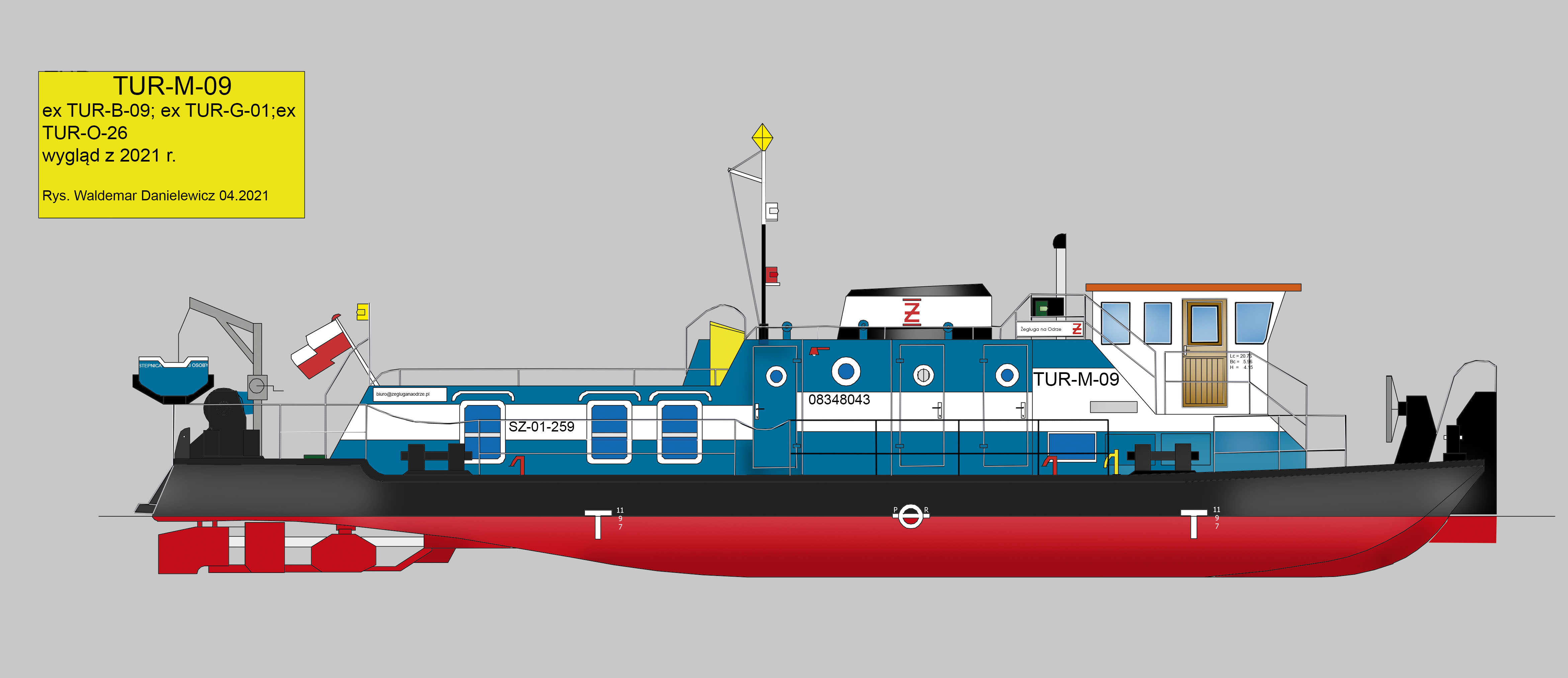 POPRZEDNIE NAZWY: ex TUR-B-09, ex TUR-G-01, ex TUR-O-26. TYP STATKU: pchacz typu Tur I. ROK I MIEJSCE BUDOWY: 1964, Tczewska Stocznia Rzeczna w Tczewie. STOCZNIOWY NUMER BUDOWY: B054T/21. WYMIARY: 2008: SILNIKI GŁÓWNE: 2 silniki wysokoprężne typu B-120W, 4-cylindrowe, moc 2 x 120 KM/88 kW, średnica cylindra 195 mm, skok tłoka 260 mm, liczba obrotów silnika/pędnika 425/425 na minutę, rok produkcji 1963, numery fabryczne 114/478 i 114/479, producent: Puckie Zakłady Mechaniczne w Pucku. ↓ 1982: INNE DANE: materiał: dno: stal, burty: stal, pokład: stal, kadłub nitowany o poprzecznym układzie wiązań, pędniki: 2 śruby, prędkość 12 km/h, załoga 3 osoby. ARMATOR: Żegluga na Odrze, Leszek Kiełtyka, Stepnica. PORT MACIERZYSTY: Stepnica. NUMERY REJESTRACYJNE: 722 [RDW Tczew], Gd-I-1 [IŻŚr Gdańsk], Bg-I-226 [IŻŚr Bydgoszcz], BG-01-080 [UŻŚr Bydgoszcz], SZ-01-269 [UŻŚr Szczecin]. NUMER ENI: 08348043. SYGNAŁ WYWOŁAWCZY: SR6036 [TUR-B-09], SR3690 [TUR-M-09]. NUMER PRS: 23417 → 230417.