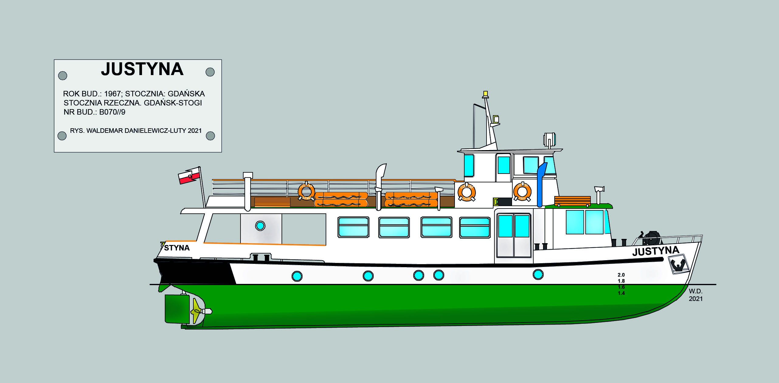 Zbudowany jako prom portowy projektu PP-120 dla Żeglugi Gdańskiej, nazwany „LUCYNA”. Eksploatowany w porcie gdańskim na trasie Nowy Port – Wisłoujście jako prom dla pracowników portu i marynarzy. Używany był także jako statek pasażerski w porcie, przewożąc wycieczkowiczów, a nawet na Zalewie Wiślanym. Wycofany w 1991 r. Rok później sprzedany osobie prywatnej z przeznaczeniem na statek-kawiarnię. Przeholowany do Górek Wschodnich, tam w 1993 r. przewrócił się na burtę i tak leżał do 1995 r., kiedy to w lipcu został pocięty na złom. Jak się okazało kadłub statku miał być przykrywką dla handlarzy metali kolorowych, którzy przedstawiali w punktach złomowych jakoby sprzedawane spore ilości miedzi, mosiądzu czy brązu pochodzą z „LUCYNY”. Sprawą zajęły się organy ścigania, jaki był finał tej sprawy, nie wiem. Byłem nawet przesłuchiwany przez policję jako przedstawiciel Żeglugi Gdańskiej. © Opracował Waldemar Danielewicz – 10.07.2024 |