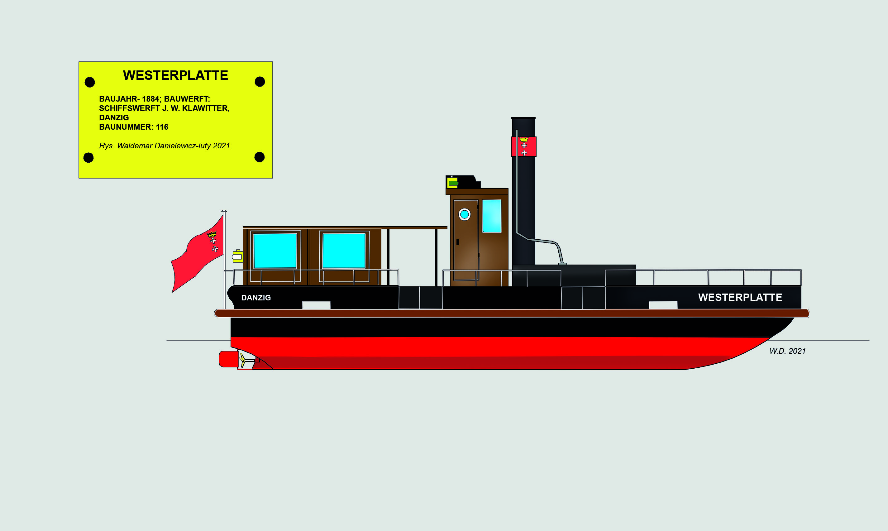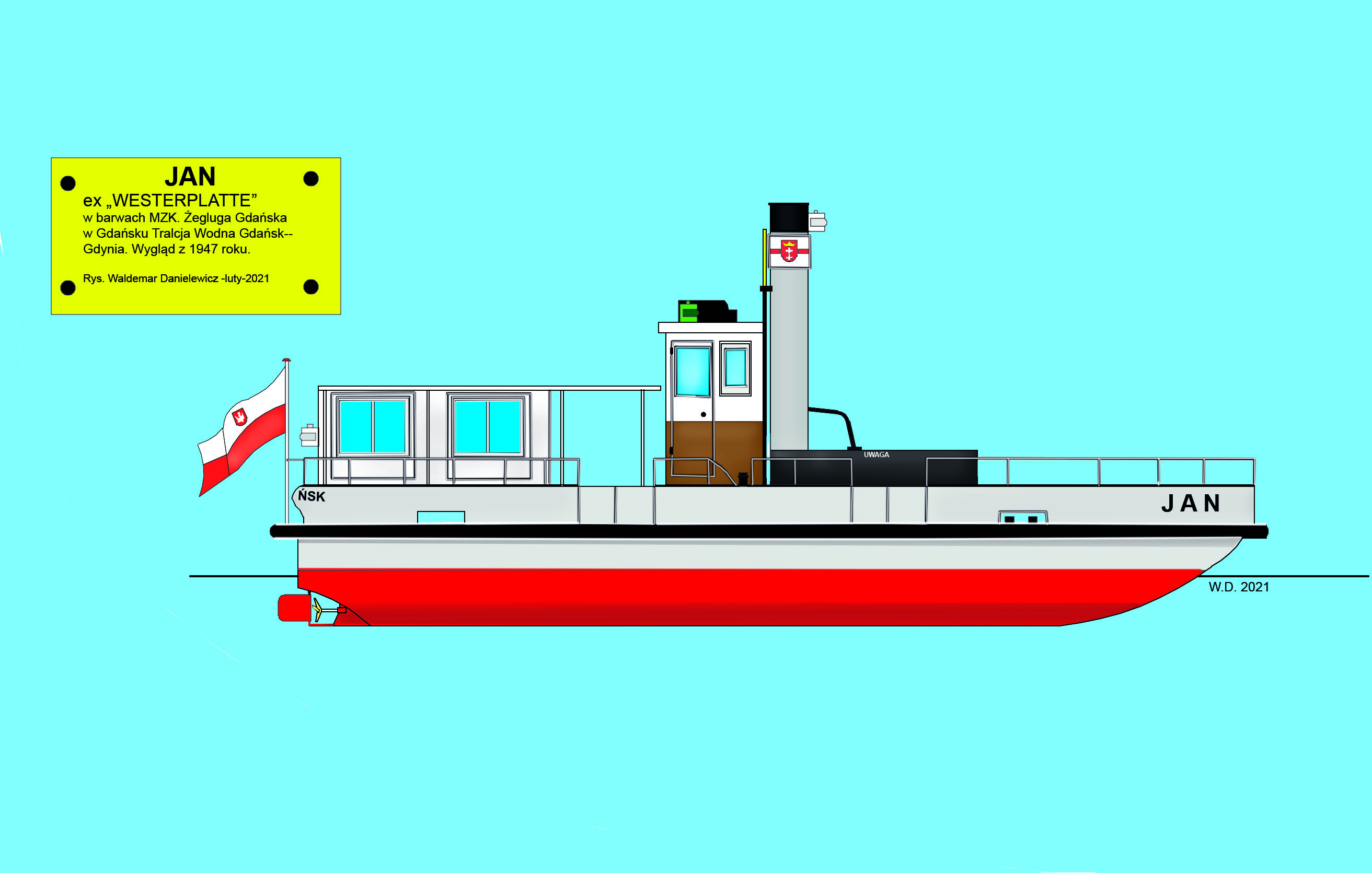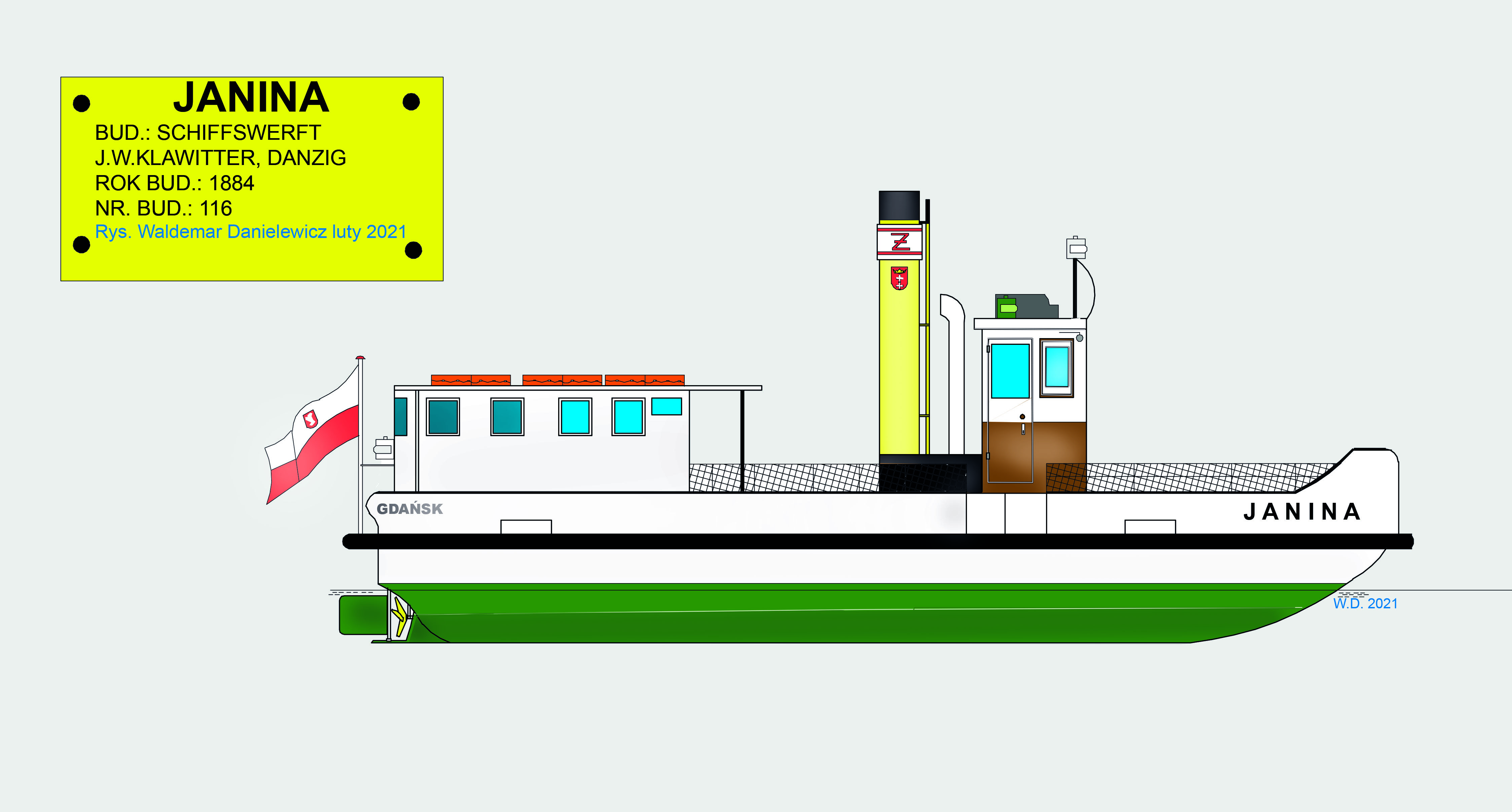 Zbudowany w 1884 roku jako prom o napędzie bocznokołowym, którego celem był przewóz kuracjuszy z Nowego Portu [Neufahrwasser] na Westerplatte, gdzie zbudowano uzdrowisko z halą plażową. Nazwany „WESTERPLATTE” posiadał maszynę parową o mocy 15 KM. Jego armatorem był John Gibsone – Danziger Schiffahrts A.G. jeden z udziałowców kąpieliska. Około 1890 roku „WESTERPLATTE” stało się własnością armatora „Weichsel” Danziger Dampschiffahrt und Seebad, który przejął kontrolę nad kąpieliskiem. W 1905 roku niepotrzebny już statek wystawiono na sprzedaż, zakupiony dwa lata później przez firmę Kaiser Wilhelm Canalverwaltung [dz. Kanał Kaszubski], używany był do przewozu pracowników na odcinku Holm [dz. Ostrów] – Troyl [dz. Gdańsk-Przeróbka] Stacja kolejowa towarowa, jako że nie było wówczas jeszcze mostu Siennickiego. W 1921 roku, kiedy zarząd nad portem przejęła polsko-gdańska Rada Portu i Dróg Wodnych Wolnego Miasta Gdańska, prom stał się bezużyteczny. Zakupiony przez powstałe w 1924 roku Danziger Städtische Fähren [Gdańskie Promy Miejskie], które zajmowało się komunikacją wodną pomiędzy dzielnicami Gdańska położonymi nad wodą. Prom postanowiono przebudować, zlikwidowano boczne koła łopatkowe montując napęd śrubowy. Wymieniono maszynę parową, nowa miała moc 55 KM. Remont i przebudowę przeprowadziła stocznia J. W. Klawitter Werft GmbH w Gdańsku. Do eksploatacji wszedł w 1926 roku na linii Krantor [Żuraw gdański] – Bleihof [Ołowianka] czyli tam, gdzie dziś pływa prom „MOTŁAWA”. W 1932 roku „WESTERPLATTE” skierowano do obsługi połączenia pomiędzy Stocznią Gdańską a Polskim Hakiem. W latach 1939-40 prom przeszedł remont połączony z wymianą kotła parowego. Zatopiony w marcu 1945 roku w Nowym Porcie, wydobyty w listopadzie 1945 roku przez ekipy Żeglugi Państwowej, został przejęty przez Zjednoczenie Przedsiębiorstw Państwowych w Gdańsku i skierowany na remont do ówczesnej Stoczni Nr 4 w Gdańsku [dawna Wojan Werft]. Już podczas remontu 19.12.1945 roku trafił do Miejskich Zakładów Komunikacyjnych w Gdańsku. Te w marcu 1946 roku powołały MZK Żegluga Gdańska – Trakcja Wodna Gdańsk-Gdynia i remontowany „WESTERPLATTE” wszedł w skład jej taboru. Remont zakończono w połowie 1946 roku przekazując statek armatorowi, ten nadał mu nazwę „JAN”. Obsługiwał trasę: Gdańsk Rybi Rynek [Targ Rybny] – Zawiśle [Przeróbka] – Holm – Poczta Polska – Elewatory – Nowy Port. Rok później skierowany do obsługi trasy: Rybi Rynek – Zawiśle, a od 1948 roku na linii: Nowy Port Dworzec Wiślany – Basen Górniczy. Po likwidacji Żeglugi Gdańskiej statek przejęła w 01.04.1949 Żegluga Przybrzeżna Przedsiębiorstwo Państwowe w Gdańsku, zmieniono nazwę na „JANINA”. Eksploatowany z wycieczkami po porcie gdańskim. W 1953 roku „JANINA” staje się własnością Polskiej Żeglugi Przybrzeżnej w Gdańsku, która również używa go jako statku wycieczkowego po porcie gdańskim, a nawet w rejsach do Sopot. W styczniu 1956 roku statek przejmuje P.P. Bydgoska Żegluga na Wiśle Ekspozytura w Gdańsku przywracając mu funkcję promu na linii: Dworzec Wiślany – Basen Górniczy. Rok później statek przejmuje nowopowstała P.P. Żegluga Gdańska w Gdańsku. Statek przechodzi remont i przebudowę w Gdańskiej Stoczni Rzecznej w Gdańsku, co zmienia sylwetkę statku. W 1958 roku statek wraca na linię promu portowego. Wycofany w 1963 roku po 79 latach eksploatacji. Żywot „JANINA” zakończyła w Bazie Remontowej Żeglugi Gdańskiej w Gdańsku-Stogach. © Opracował Waldemar Danielewicz – 13.02.2021 |