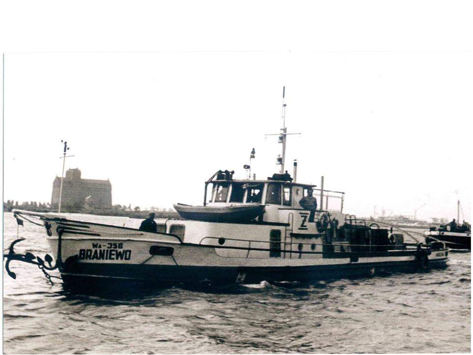 Budowę tego statku jako holownika rozpoczęto w 1944 roku w stoczni Weichselwerft Hellmut Wulff w Solcu Kujawskim pod nazwą „UWE”. W chwili zakończenia wojny w maju 1945 roku nieukończony kadłub pozostał na pochylni. Po przejęciu stoczni przez władze polskie komisja stwierdziła, że holownik ten wraz z wszystkimi urządzeniami jest ukończony w 85%. Po pozytywnym zaopiniowaniu przez wspomnianą komisję budowę miała dokończyć Państwowa Stocznia w Solcu Kujawskim, jednak likwidacja stoczni w 1946 roku spowodowała, że kadłub przeholowano do Płocka, gdzie ukończono budowę dopiero w 1950 roku jako statek holowniczo-pasażerski. Co ciekawe budowany holownik miał cztery śruby napędzane dwoma silnikami firmy MAN o mocy 300 KM każdy. Jednak w czasie przebudowy wstawiono dwa silniki dwusuwowe produkcji USA Gray Marine, każdy z nich napędzał jedną śrubę. Nazwany „BRANIEWO” przydzielony został Państwowej Żegludze Śródlądowej we Wrocławiu Ekspozytura Gdańsk-Gdynia. W sezonie wiosenno-letnim wykorzystywany był jako statek pasażerski. Zabierał 50 osób i pływał na regularnej linii Gdańsk – Nowy Dwór Gdański – Gdańsk wożąc głównie rolników ze swoimi wyrobami na targ do Gdańska, a potem z Gdańska do Nowego Dworu Gdańskiego. Po sezonie używany był jako holownik. W 1951 roku „BRANIEWO” wchodzi w skład nowopowstałego P.P. Żegluga na Wiśle w Warszawie Ekspozytura Rejonowa w Gdańsku. Jego zatrudnienie nie zmienia się. W lipcu 1954 roku statek przejmuje nowo powołana Bydgoska Żegluga na Wiśle w Bydgoszczy Ekspozytura Gdańsk-Gdynia. „BRANIEWO” nadal pływa do Nowego Dworu Gdańskiego i Elbląga. W styczniu 1957 roku po raz kolejny zmienia armatora – tym razem przejęty został przez P.P. Żegluga Gdańska w Gdańsku. Pływa jako statek wycieczkowy po porcie gdańskim oraz z Gdańska do Rybiny. W 1962 roku „BRANIEWO” uległ awarii silników i został wycofany, niesprawny statek przejęła Warszawska Żegluga na Wiśle w Warszawie. Przeprowadzony na holu holownika „GOPŁO” dotarł do Bazy Remontowej w Płocku, gdzie przywrócono mu charakter holownika. Wstawiono mu nowe silniki produkcji krajowej o mocy 300 KM. Do eksploatacji wszedł w 1965 roku, pływał już w barwach P.P. Żegluga Warszawska w Warszawie do 1977 roku. Po wycofaniu został przekazany do Kolejowego Klubu Wodnego w Warszawie. Stacjonował w Jachrance na Jeziorze Zegrzyńskim. Złomowany został w 1994 roku. © Opracował Waldemar Danielewicz – 22.06.2025/05.03.2026 |