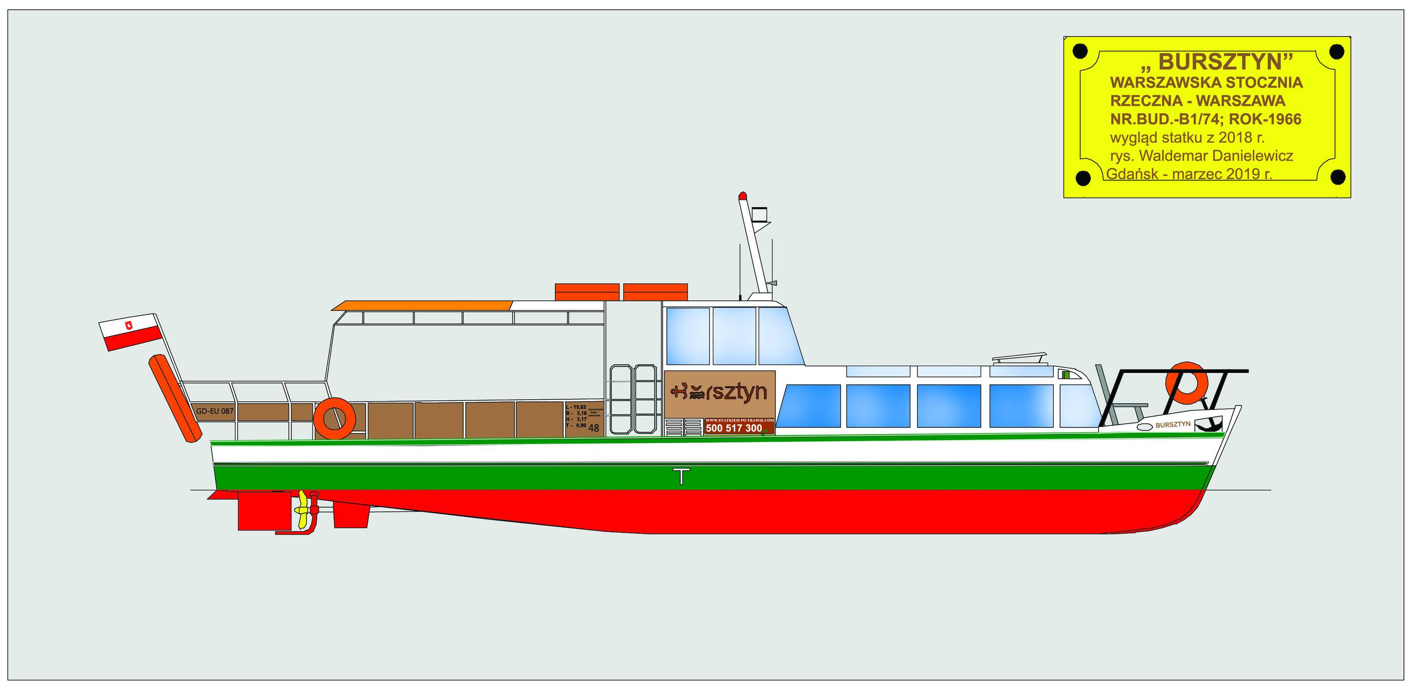 Jeden z serii statków typu SP-45 budowanych seryjnie przez Warszawską Stocznię Rzeczną dla różnych armatorów. Opisywany statek zbudowano w 1966 r. dla Zarządu Wojewódzkiego Parku i Kultury w Chorzowie, tam nazwany „KAROLINKA”. Na pokład zabierał 34 osoby. W 1994 r. przeszedł remont połączony z wymianą silnika. Od 1997 r. armatorem został Wojewódzki Park Kultury i Wypoczynku im. J. Ziętka w Chorzowie. Wycofany w 2010 roku i przeznaczony na sprzedaż. Zakupiony przez Bartłomieja Rucińskiego w 2011 r. został przetransportowany do Ostródy, gdzie przeszedł remont i przebudowę sposobem gospodarczym, która trwała kilka lat. W 2017 r. wszedł do służby pod nazwą „BURSZTYN”. Eksploatowany na Kanale Elbląskim. © Opracował Waldemar Danielewicz – 25.12.2023 |