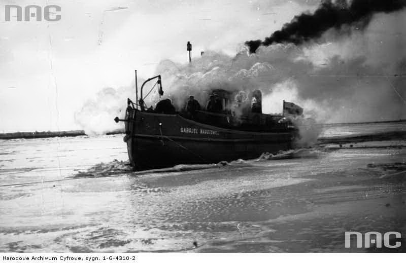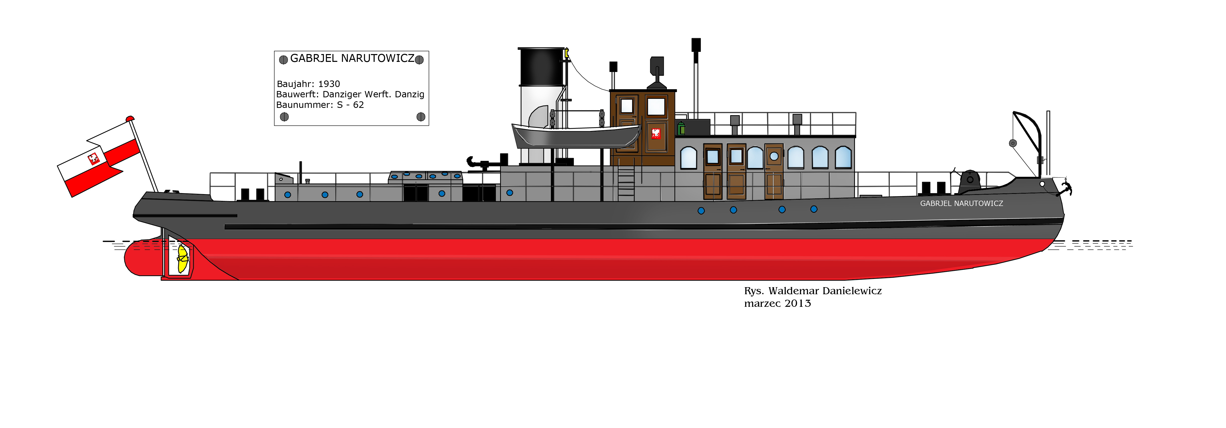POPRZEDNIE NAZWY: ex NAREW, ex GABRJEL NARUTOWICZ. TYP STATKU: lodołamacz parowy czołowy. ROK I MIEJSCE BUDOWY: 1930, Danziger Werft u. Eisenbahnwerkstätten A.G., Danzig [Wolne Miasto Gdańsk]. STOCZNIOWY NUMER BUDOWY: S-62. WYMIARY: długość całkowita 34,00 m, szerokość całkowita 5,70 m, szerokość na wręgach 5,20 m, wysokość burt 2,50 m, wysokość nierozbieralna 6,00 m, zanurzenie min. 1,70 m, zanurzenie maks. 2,10 m. SILNIK GŁÓWNY: 1 maszyna parowa stojąca potrójnego rozprężania, 3-cylindrowa, moc 220 KM przy obr/.min, średnice cylindrów 261/414/651 mm, skok tłoka 350 mm, liczba obrotów silnika/pędnika 200/200 na minutę, rok produkcji 1930, numer fabryczny 401, producent: Danziger Werft u. Eisenbahnwerkstätten A.G., Danzig. KOCIOŁ PAROWY: 1 kocioł płomieniówkowy ogniorurkowy, ciśnienie robocze 12,5 at, powierzchnia ogrzewalna 74,4 m2, rok budowy 1930, numer fabryczny 633, producent: Danziger Werft u. Eisenbahnwerkstätten A.G., Danzig. INNE DANE: materiał: dno: stal, burty: stal, pokład: drewno, kadłub nitowany o poprzecznym układzie wiązań, pędnik: 2 śruby czteropłatowe o średnicy 1500 mm, prędkość 17 km/h, załoga 7 osób. ARMATOR: Przedsiębiorstwo Budownictwa Wodnego w Warszawie, Baza w Płocku. PORT MACIERZYSTY: Płock. NUMERY REJESTRACYJNE: 5718 [PZW Tczew], 628 [RDW Tczew], Gd-I-16 [IŻŚr Gdańsk]. NUMER PRS: 23268 → 230268.