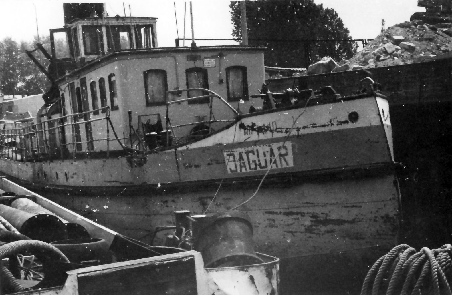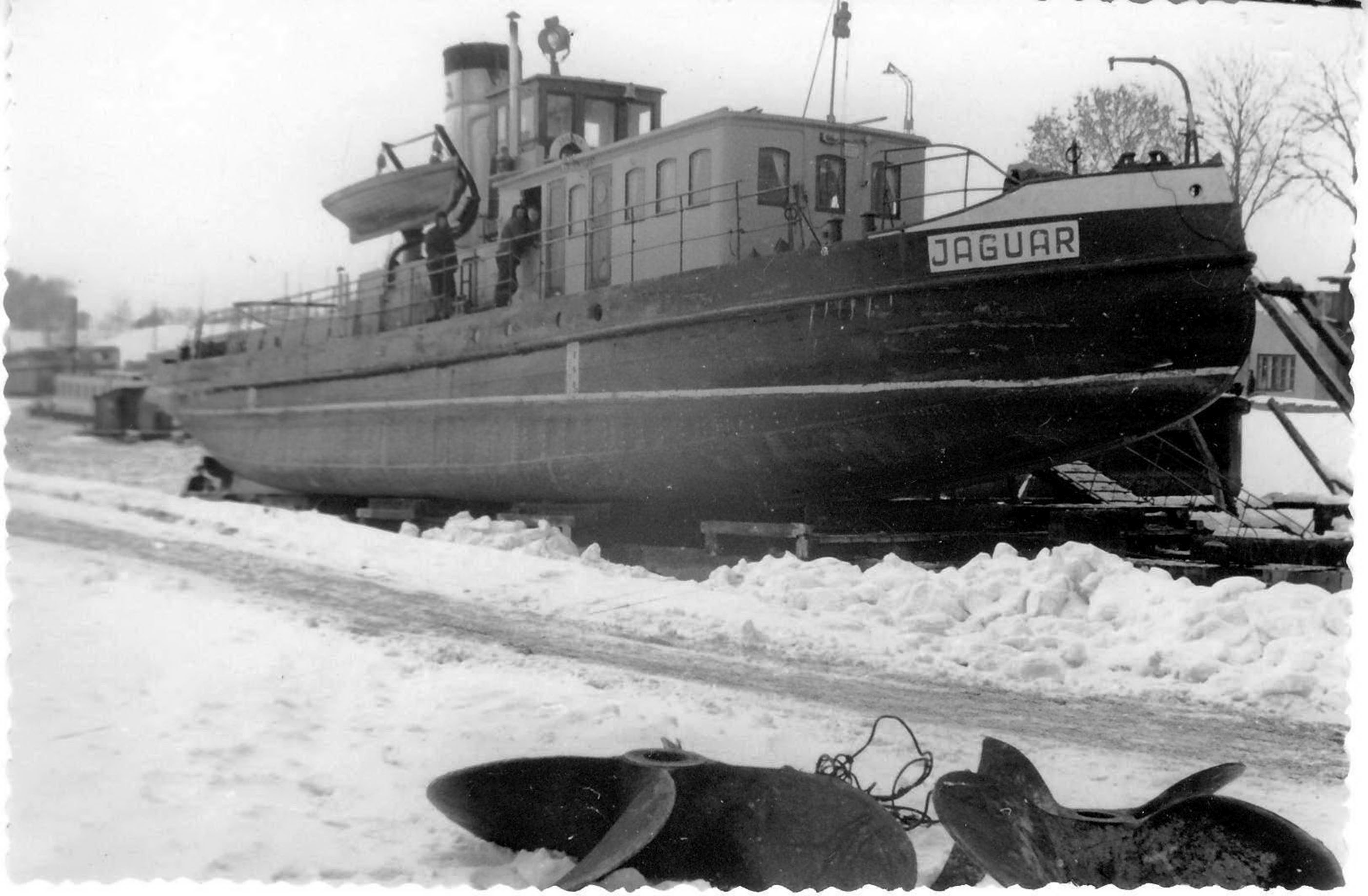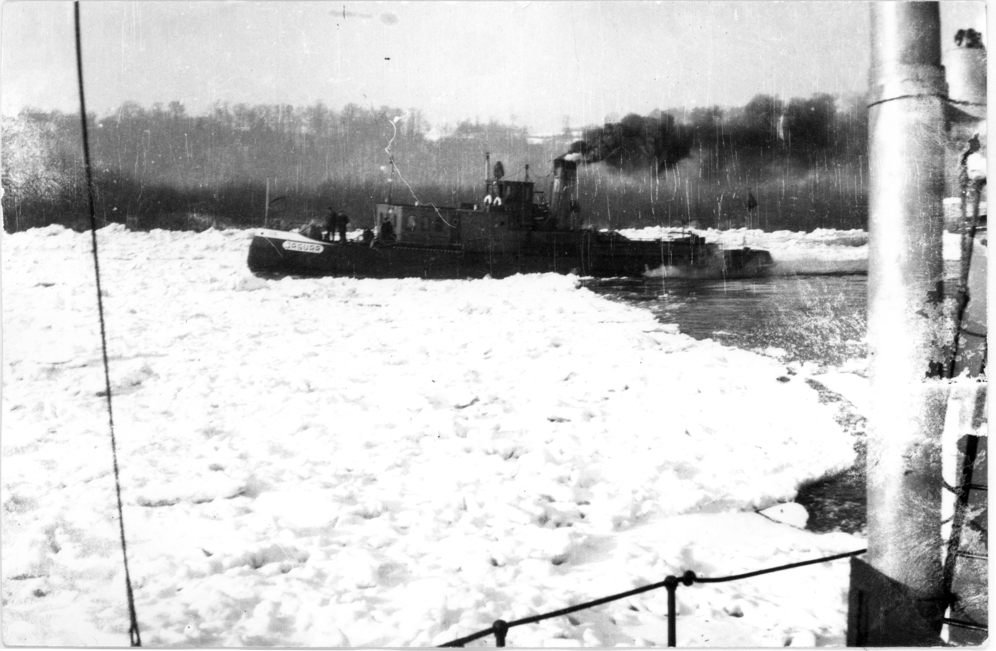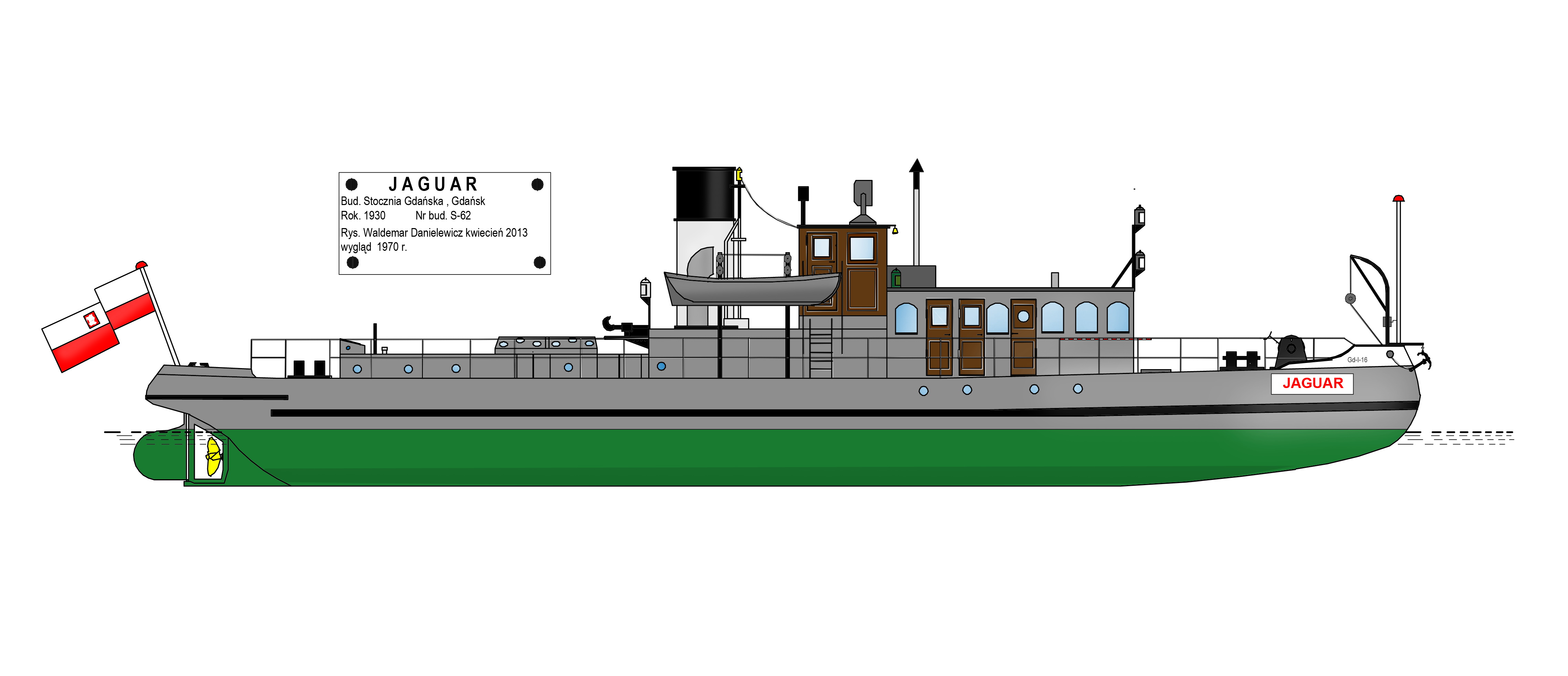 Zbudowany jako lodołamacz czołowy na zamówienie Dyrekcji Dróg Wodnych w Toruniu. Nazwany „GABRJEL NARUTOWICZ”. Stacjonował w Tczewie, początkowo znajdował się w gestii Zarządu Dróg Wodnych, a od 1933 r. należał do Państwowego Zarządu Wodnego w Tczewie. We wrześniu 1939 roku po zajęciu Tczewa przez Niemców dostał się w ich ręce. Przemianowany na „NAREW” i 23 października 1939 r. przydzielony do Wasserbauamt, Einlage [dz. Gdańsk-Przegalina]. W kwietniu 1941 roku zmienił nazwę na „JAGUAR”. W 1942 roku przebudowany. W marcu 1945 roku odpłynął z niemieckimi uciekinierami z Gdańska do Hamburga. Po zakończeniu działań wojennych przejęty przez brytyjskie Ministry of War Transport. W marcu 1947 roku zwrócony Polsce i przejęty przez Polską Misję Morską. Sprowadzony śródlądziem do Szczecina w lipcu 1947 roku, a potem do Gdańska, gdzie przeszedł remont w ówczesnej Stoczni Nr 1 w Gdańsku. Do ruchu wszedł w 1948 roku pod niezmienioną nazwą „JAGUAR”. Portem macierzystym statku został Tczew. 17 stycznia 1950 roku podczas obrony mostów w Tczewie przed zatorem osiadł na mieliźnie „JAGUAR”, a zaraz za nim „PANTERA”. Na pomoc mimo niebezpieczeństwa, bo ruszyła się pokrywa lodowa ruszył lodołamacz „KUNA”, któremu udało się ściągnąć „JAGUARA”, po czym obydwie jednostki walczyły o uwolnienie „PANTERY”, co w końcu się udało i trzy lodołamacze odeszły do Knypawy. Sytuacja powtarza się 27 stycznia, kiedy to „KUNA” ponownie ratuje z opresji „JAGUARA” i „TYGRYSA”, uwalniając je z zatoru lodowego na 856 km rz. Wisły. W tym okresie kapitanem statku był Antoni Muntowski, a sternikiem Zygfryd Wesołowski. Po likwidacji P.Z.W. [1949] i D.O.D.W. [1951] „JAGUAR” podlegał pod Rejon Dróg Wodnych w Tczewie. W 1960 roku lodołamacz przekazany został do Rejonu Dróg Wodnych w Szczecinie, gdzie gdzie pracował do 1964 roku, po czym powrócił do Okręgowego Zarządu Wodnego w Tczewie. Decyzją Centralnego Zarządu Dróg Wodnych „JAGUAR” w 1971 roku trafił do Okręgowego Zarządu Wodnego w Płocku, a dwa lata później do Przedsiębiorstwa Budownictwa Wodnego w Warszawie Oddział w Płocku. W 1975 roku wycofany z ruchu i przeznaczony na wytwórnię pary. W 1981 roku odstawiony w Płocku na terenie P.B.W. W 1984 roku wrak przeholowano do Warszawy, gdzie stał w porcie żerańskim. Mimo prób ratowania go przed palnikami został złomowany w 1988 r. © Opracował Waldemar Danielewicz – 09.02,2011 |