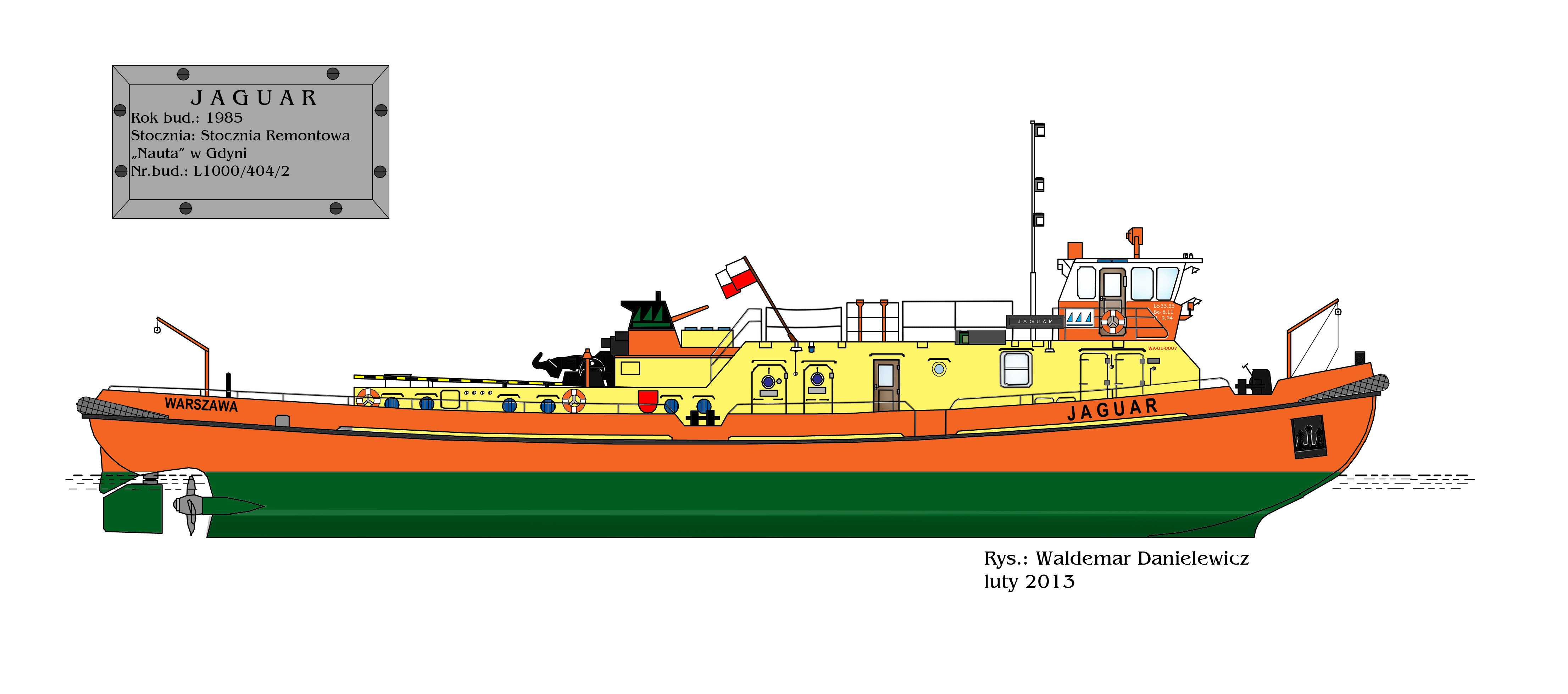 Ponieważ chronicznie odczuwano brak lodołamaczy czołowych Centrum Badawczo-Projektowe Żeglugi Śródlądowej „Navicentrum” we Wrocławiu przystąpiło do opracowania projektu takiego lodołamacza. Zespół pracował pod kierownictwem mgr inż. J. Kamionki, który jest głównym projektantem statku określanego jako typ L-1000. Budowa kadłuba została poprzedzona serią prób modelowych prowadzonych przez Politechnikę Gdańską na jez. Jeziorak w Iławie. Z uwagi na użycie silnika głównego nienawrotnego zastosowano po raz pierwszy w budowie lodołamaczy śruby nastawne. Wybudowanie powierzono Stoczni Remontowej „Nauta” z Gdyni. W sumie zbudowano w latach 1985-1988 dziesięć sztuk tych lodołamaczy w tym dwa na Odrę. Zwodowany w 1985 r., nazwany został „JAGUAR”, był to drugi lodołamacz o tej nazwie w polskiej flocie lodołamaczy. Początkowo „JAGUAR” przeznaczony był dla Przedsiębiorstwa Budownictwa Wodnego w Tczewie. Jednak w trakcie prób z lodołamaczem „TYGRYS”, ze względu na częste sytuacje awaryjne prototypu, postanowiono go zostawić w P.B.W. w Tczewie, a do Warszawy przekazać „JAGUARA”. Lodołamacz stacjonuje we Włocławku. Od 2013 r. w Regionalnym Zarządzie Gospodarki Wodnej w Warszawie. Nadal w eksploatacji. © Opracował Waldemar Danielewicz – 25.01.2024 |