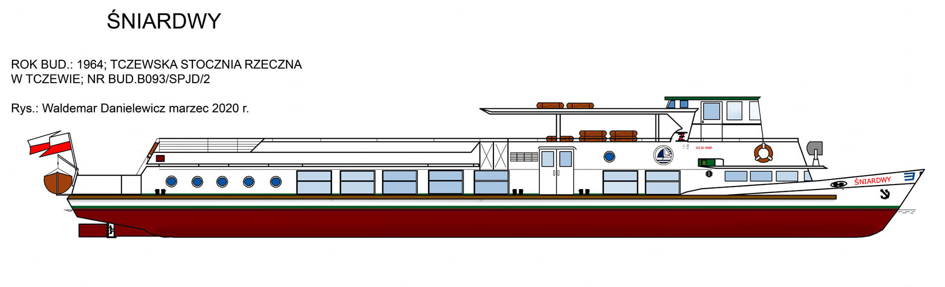 Statek pasażerski typu SPJD [statek pasażerski jeziorowy duży] (spotyka się też określenie SJD [statek jeziorowy duży]) zaprojektowany przez wrocławskie Biuro Studiów i Projektów Taboru Rzecznego. Zbudowany jako drugi z serii w Tczewskiej Stoczni Rzecznej w Tczewie dla P.P. Żegluga Mazurska w Giżycku, nazwany „ŚNIARDWY”. Eksploatowany na Wielkich Jeziorach Mazurskich. Pierwotnie liczbę pasażerów ustalono na 305 osób. Po przebudowie w 1987 r. zmniejszono ich liczbę do 140 osób. Od 1992 r. w Żegludze Mazurskiej Sp. z o.o. w Giżycku. W 2008 r. wymiana silnika. Nadal w eksploatacji. © Opracował Waldemar Danielewicz – 29.01.2025/13.03.2026 |