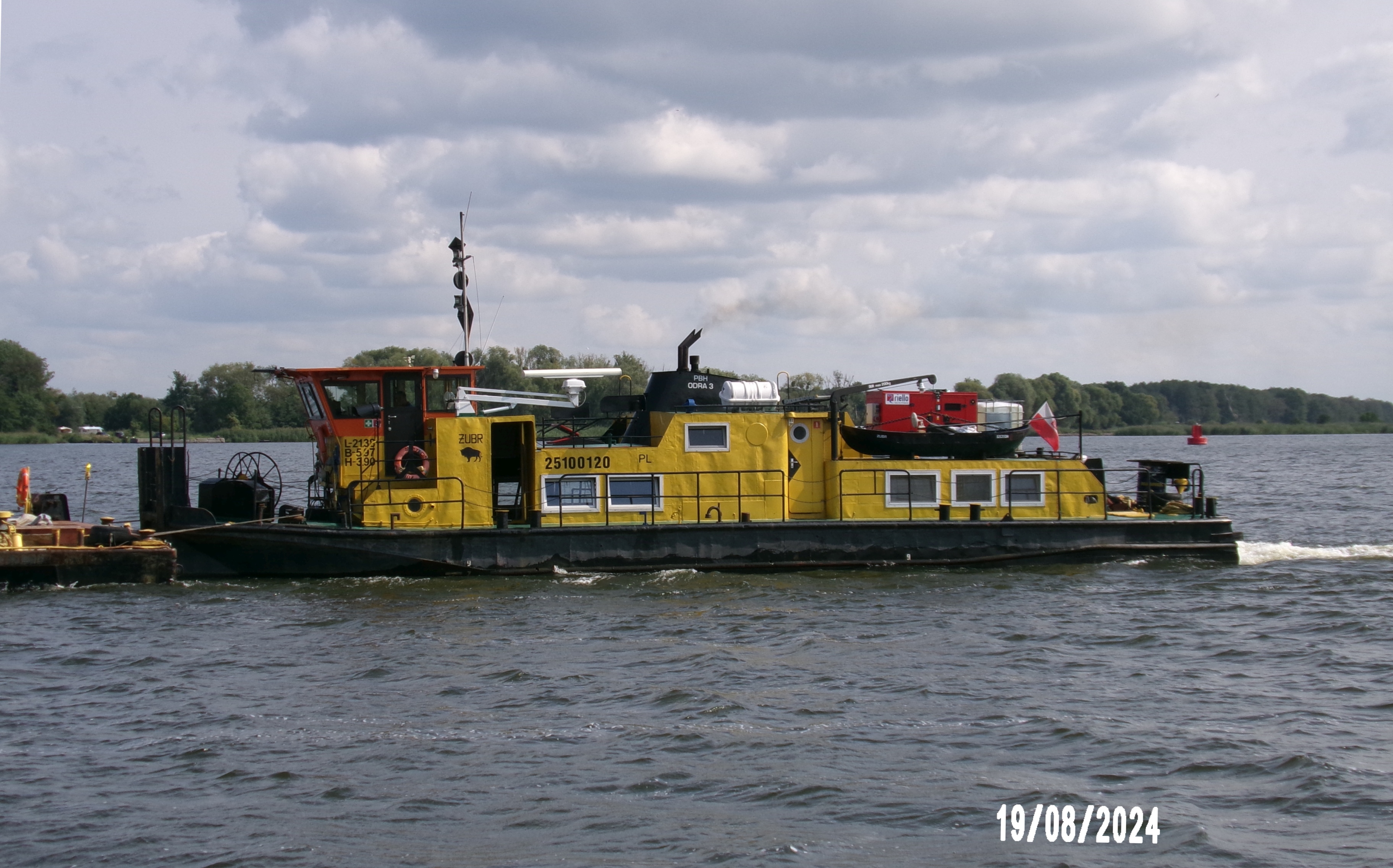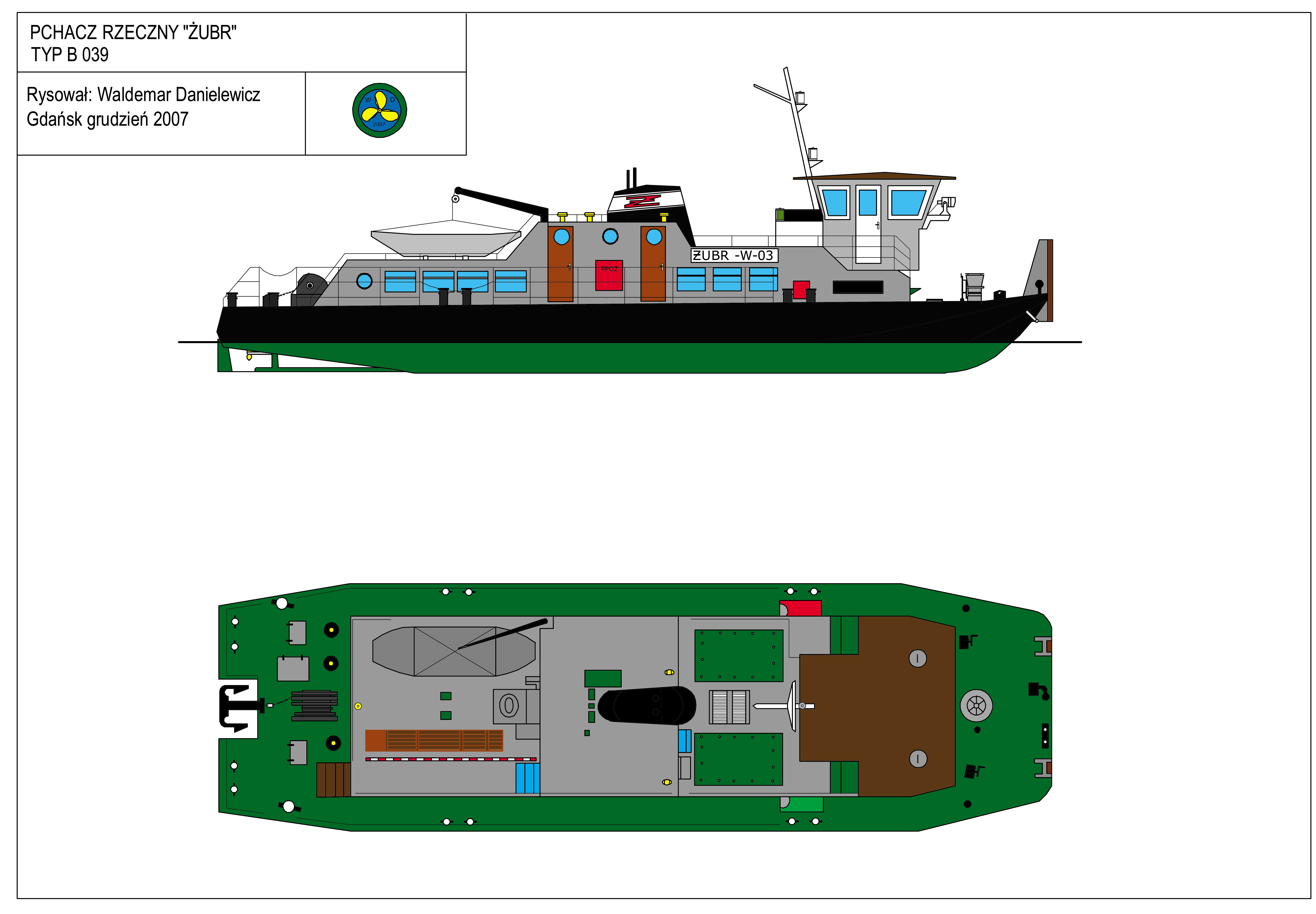 Zbudowany w 1962 r. jako pchacz typu Żubr projekt B-039 dla P.P. Warszawska Żegluga na Wiśle w Warszawie jako „ŻUBR 3”, port macierzysty Warszawa. W 1965 r. przemianowany na „ŻUBR-W-03”. Od 1964 r. w P.P. Żegluga Warszawska w Warszawie. Około 1979 r. wymiana silników. W 1995 r. zakupiony przez PBH „Odra 3” w Szczecinie i nazwany „ŻUBR”. Port macierzysty Szczecin. Od 2003 r. w PBH „Odra 3” Sp. z o.o. w Szczecinie, nadal w eksploatacji. © Opracował Waldemar Danielewicz – 20.03.2025/15.03.2026 |