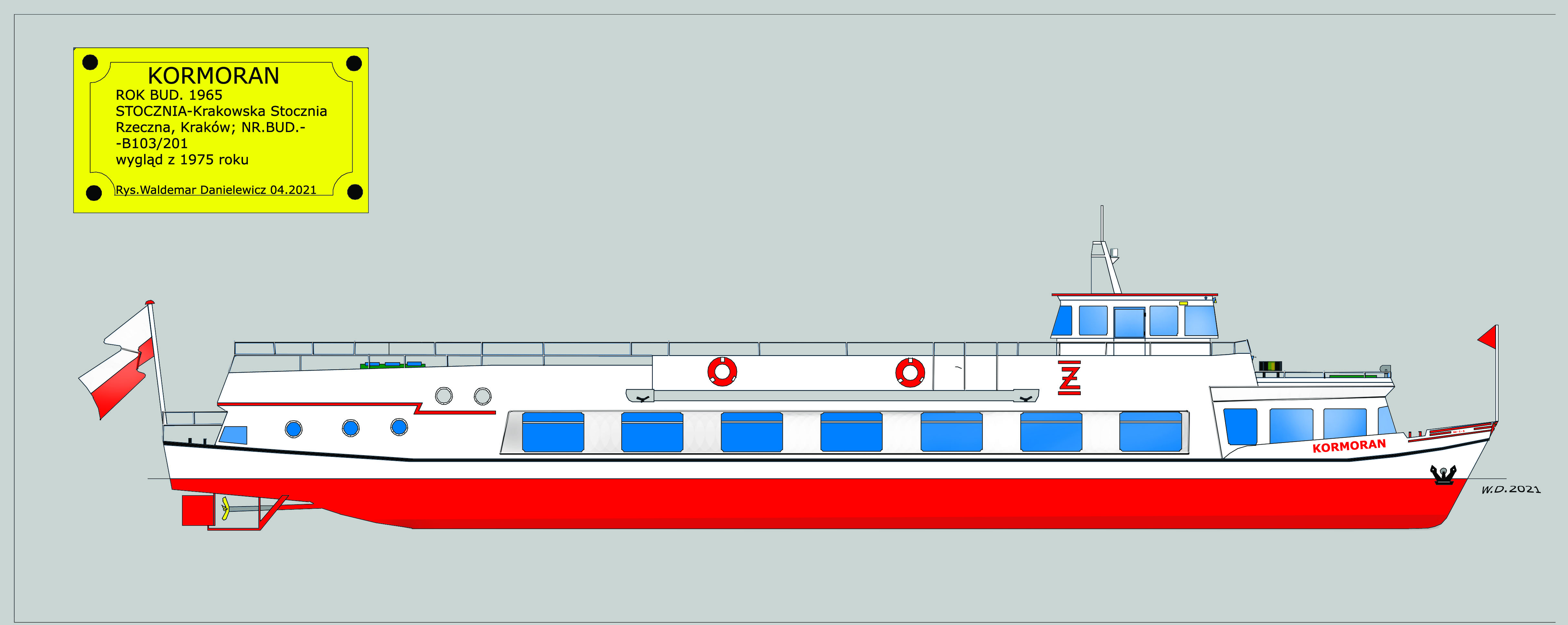 Pierwszy statek typu SPJK, czyli statek pasażerski jeziorowo-kanałowy przeznaczony na unikatową trasę, czyli Kanał Elbląski z jego pochylniami. Zaprojektowany przez Biuro Studiów i Projektów Taboru Rzecznego we Wrocławiu (projekt B-103, autorzy: T. Miklaszewski, J. Zych i E. Małecki). Zbudowany w Krakowie w tamtejszej stoczni rzecznej w 1965 r. Nazwany został „KORMORAN”, do eksploatacji wszedł w sezonie 1966 roku. Jego armatorem było P.P. Żegluga Gdańska w Gdańsku, port macierzysty Gdańsk, załoga liczyła 4 ludzi. Pływał na trasie Ostróda – Elbląg – Ostróda. Rejs w jedną stronę trwał około 10 godzin. Po sezonie 1977 roku przekazany P.P. Żegludze Mazurskiej w Giżycku Ekspozytura w Ostródzie. W roku następnym zmieniono port macierzysty na Ostródę. W 1991 roku „KORMORANA” przejęło Przedsiębiorstwo Państwowe Żegluga Ostródzko-Elbląska w Ostródzie, dwa lata później P.P. ŻO-E zostaje częścią Zakładów Komunikacji Miejskiej w Ostródzie. W 1993 roku „KORMORAN” otrzymał nowy silnik krajowej produkcji. Od 2011 roku statkiem zarządza Żegluga Ostródzko-Elbląska Sp. z o.o. w Ostródzie. Pierwszym kapitanem, który przyprowadził statek z Krakowa był Władysław Piecek, kapitanował na nim do końca sezonu 1966 roku. Później kapitanem został Andrzej Broniecki, który dowodził statkiem do końca sezonu 1991 roku. „KORMORANEM” dowodzili także między innymi: Janusz Miszewski, Tomasz Bojerle i Robert Grabowski. © Opracował Waldemar Danielewicz – 05.04.2021/17.03.2026 |