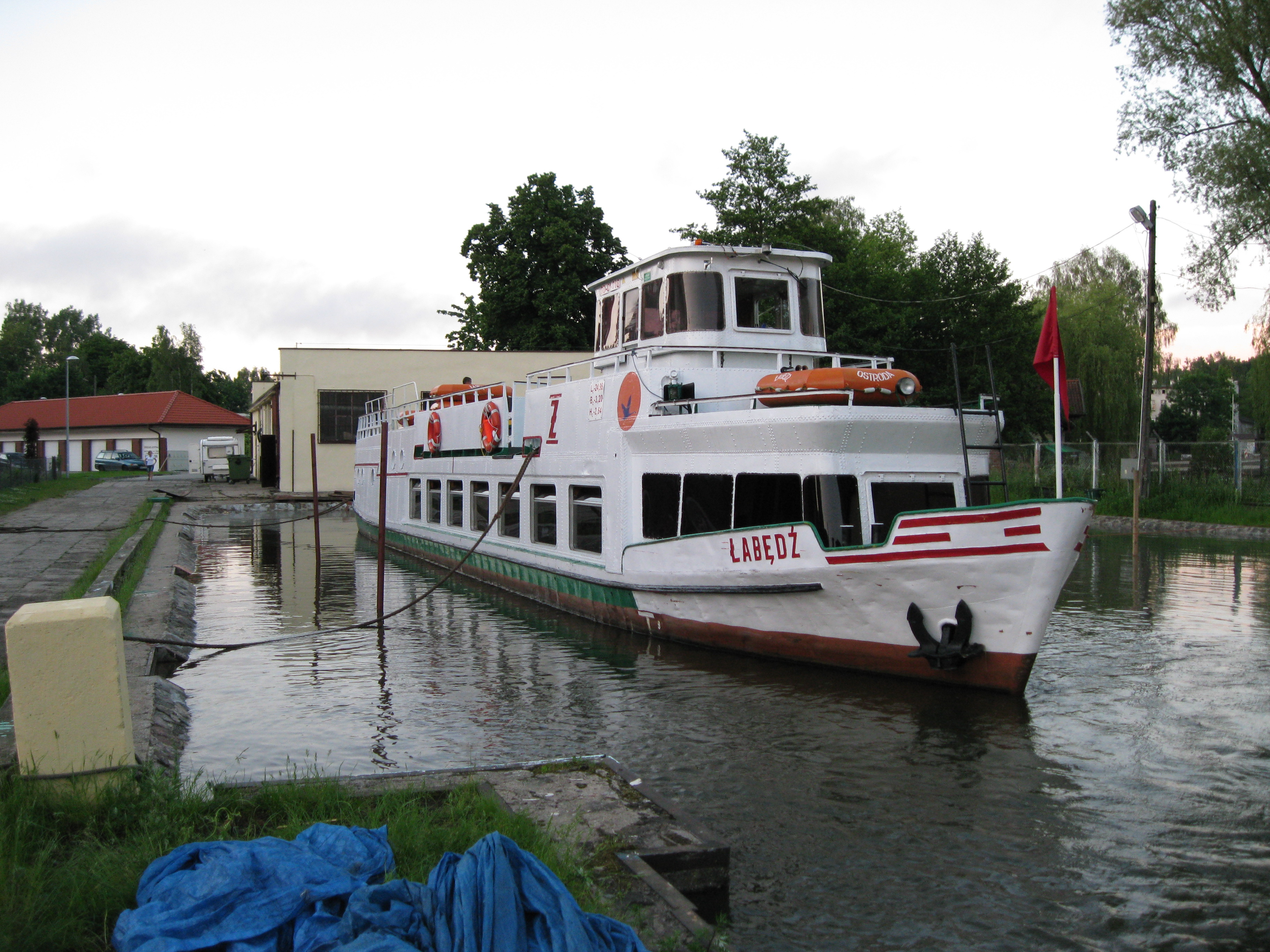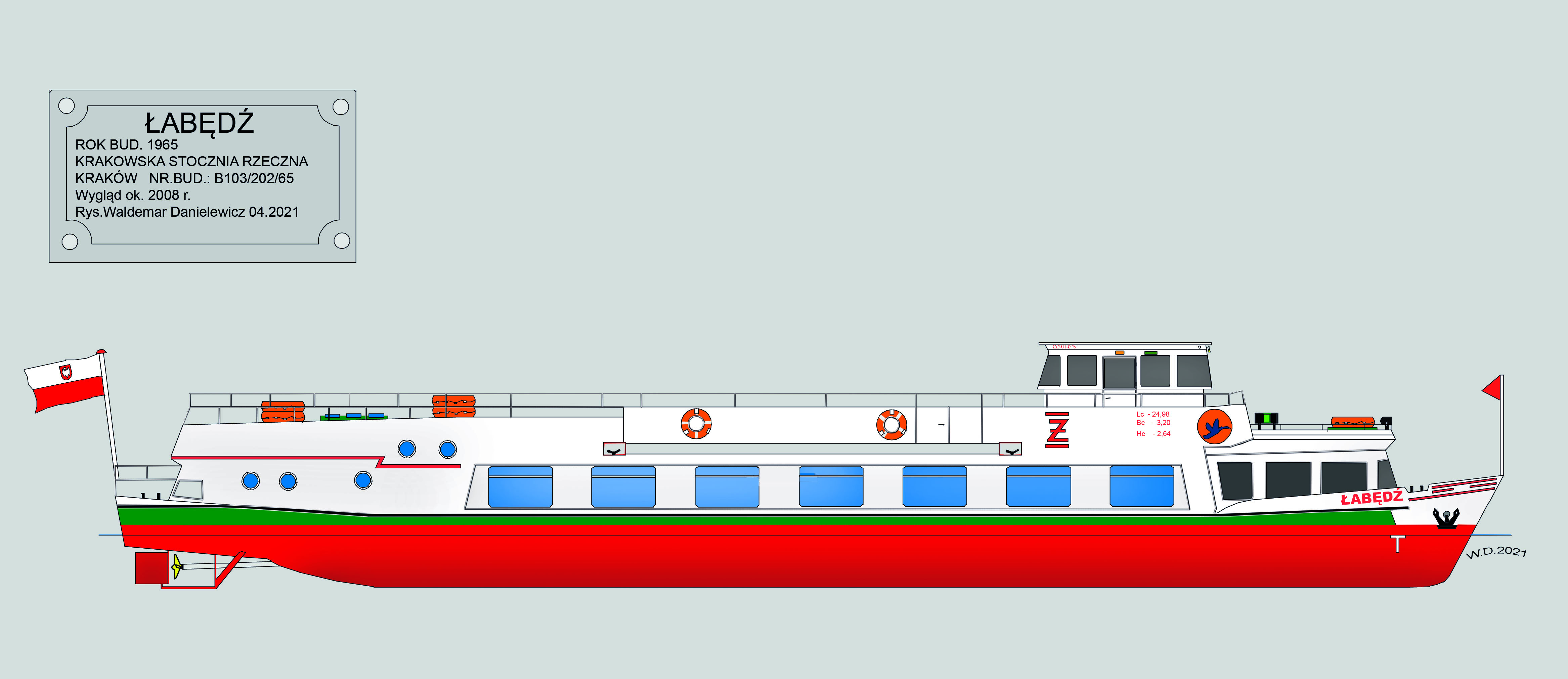Drugi statek typu SPJK, czyli statek pasażerski jeziorowo-kanałowy przeznaczony na unikatową trasę czyli Kanał Elbląski z jego pochylniami. Zbudowany w Krakowie w tamtejszej stoczni rzecznej w 1965 r. Nazwany został „ŁABĘDŹ”, do eksploatacji wszedł w sezonie 1966 roku. Jego armatorem było P.P. Żegluga Gdańska w Gdańsku, port macierzysty Gdańsk, załoga liczyła 4 ludzi. Pływał na trasie Ostróda – Elbląg – Ostróda. Rejs w jedną stronę trwał około 11 godzin. Po sezonie 1977 roku przekazany P.P. Żegludze Mazurskiej w Giżycku Ekspozytura w Ostródzie. W roku następnym zmieniono port macierzysty na Ostródę. W 1991 roku „ŁABĘDZIA” przejęło Przedsiębiorstwo Państwowe Żegluga Ostródzko-Elbląska w Ostródzie, dwa lata później P.P. ŻO-E zostaje częścią Zakładów Komunikacji Miejskiej w Ostródzie. 12.06.2000 podczas rejsu Tczew – Gniew najechał na kamienie i przebił poszycie dna, naprawiony. Na początku XXI w. „ŁABĘDŹ” otrzymał nowy silnik o mocy 90 KM. Od 2011 roku statkiem zarządza Żegluga Ostródzko-Elbląska Sp. z o.o. w Ostródzie. Od wielu lat odstawiony. Długoletnim kapitanem statku byli Kazimierz Bednarczyk i Stanisław Pawłowski. © Opracował Waldemar Danielewicz – 12.04.2021/17.03.2026 |