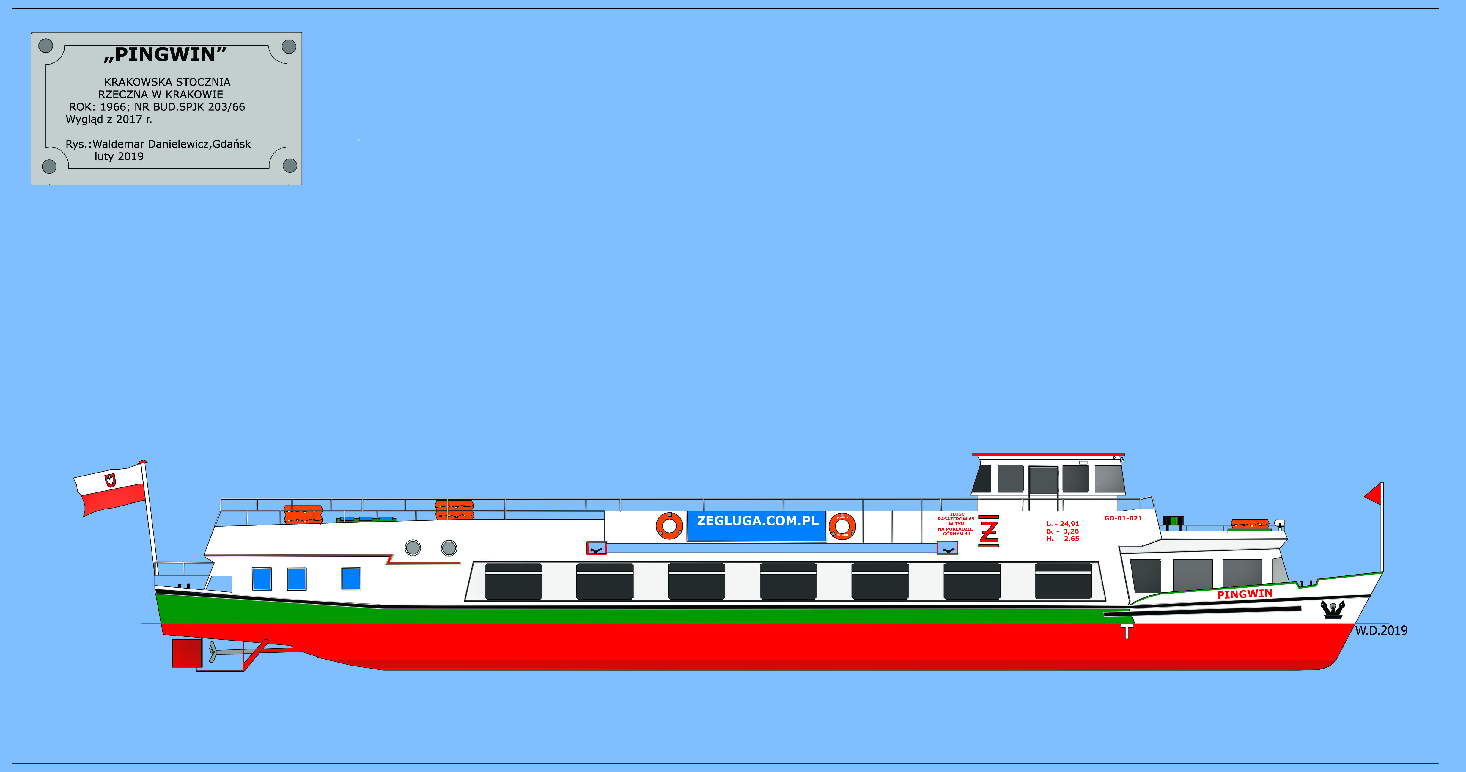 Trzeci statek typu SPJK, czyli statek pasażerski jeziorowo-kanałowy przeznaczony na unikatową trasę czyli Kanał Elbląski z jego pochylniami. Zbudowany w Krakowie w tamtejszej stoczni rzecznej w 1966 r. Nazwany został „PINGWIN”, do eksploatacji wszedł w sezonie 1966 roku. Jego armatorem było P.P. Żegluga Gdańska w Gdańsku, port macierzysty Gdańsk, załoga liczyła 4 ludzi. Pływał na trasie Ostróda – Elbląg – Ostróda. Rejs w jedną stronę trwał około 11 godzin. Po sezonie 1977 roku przekazany P.P. Żegluga Mazurska w Giżycku Ekspozytura w Ostródzie. W roku następnym zmieniono port macierzysty na Ostródę. W 1991 roku „PINGWINA” przejęło Przedsiębiorstwo Państwowe Żegluga Ostródzko-Elbląska w Ostródzie, dwa lata później P.P. ŻO-E zostaje częścią Zakładów Komunikacji Miejskiej w Ostródzie. W latach 1991-93 „PINGWIN” był w dzierżawie w rękach prywatnych [J. Stacewicz]. Na początku XXI w. „PINGWIN” otrzymał nowy silnik o mocy 100 KM. Od 2011 roku statkiem zarządza Żegluga Ostródzko-Elbląska Sp. z o.o. w Ostródzie. Eksploatowany do dnia dzisiejszego. Długoletnim kapitanem statku był Leszek Matuszewski, inni kapitanowie to między innymi Robert Pawlak i Zbigniew Pawlak. © Opracował Waldemar Danielewicz – 11.04.2021/20.03.2026 |