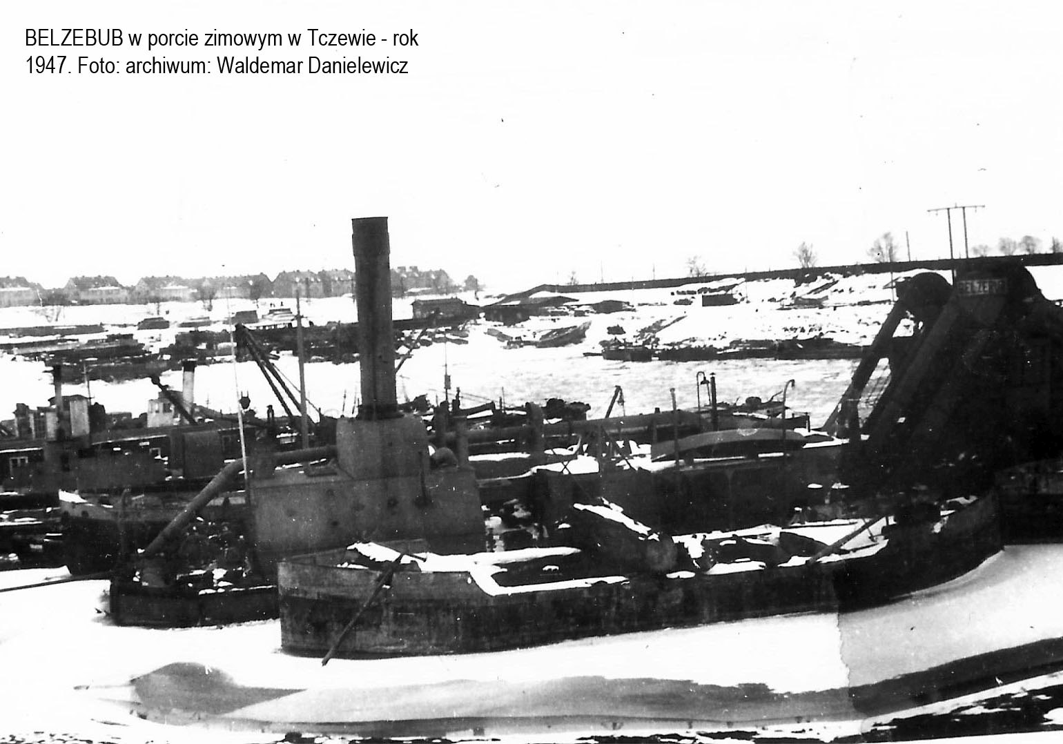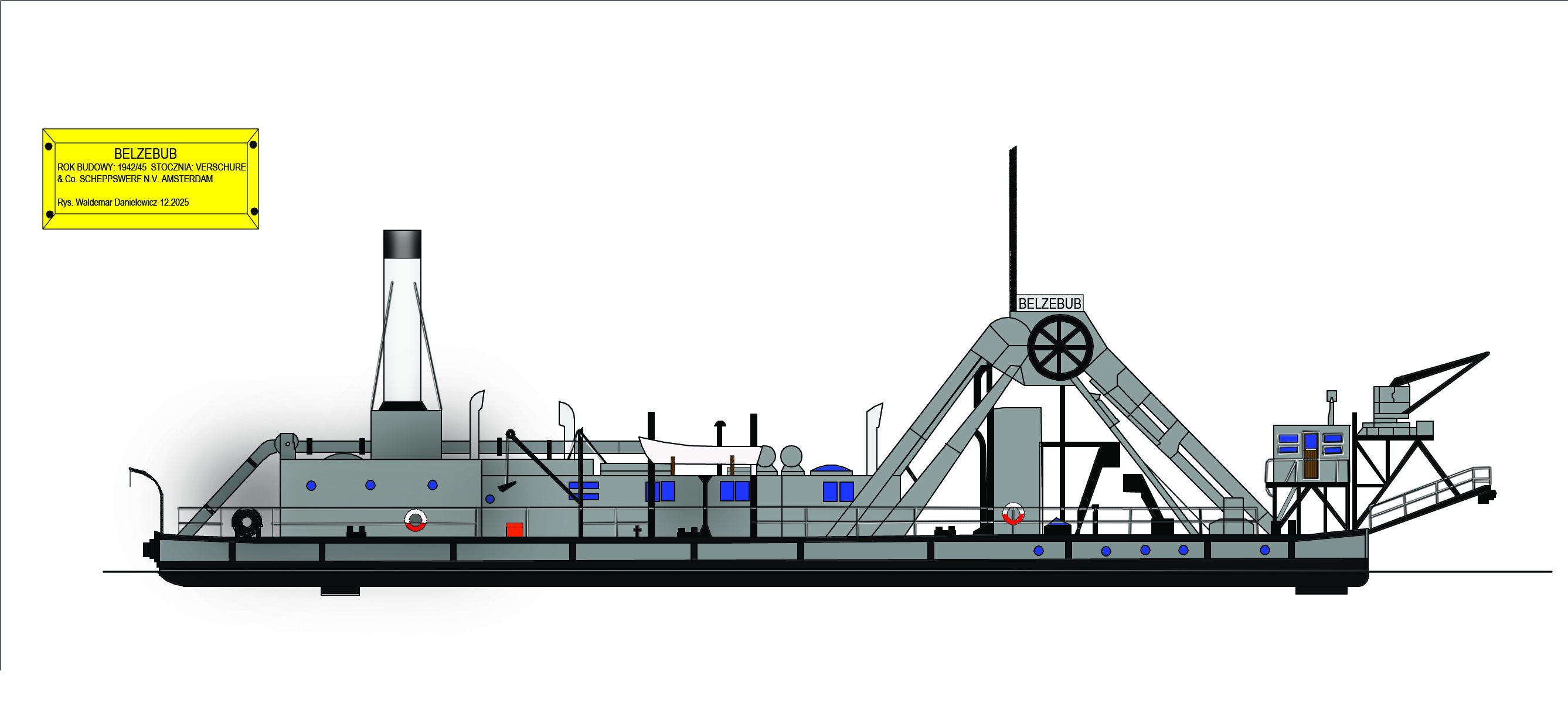 Pogłębiarka bez napędu budowana w Holandii od 1942 r. prawdopodobnie dla Niemców. Prace przerwano w 1943 r. Wznowienie budowy nastąpiło w 1946 r., kiedy to Polska nabyła dwie takie siostrzane pogłębiarki. Nazwane „BELZEBUB” i „LUCYFER”. Nabywcą było Ministerstwo Komunikacji za pośrednictwem Centrali Handlu Zagranicznego „Polimex” do pracy na Wiśle. „BELZEBUB” w 1946 r. trafił do Państwowego Zarządu Wodnego w Gdańsku, gdzie pracował przy pogłębianiu ujścia Wisły. Od 1948 r. w Dyrekcji Dróg Wodnych w Toruniu z portem macierzystym Tczew. W 1953 r. przekazany do Rejonu Dróg Wodnych w Warszawie, port macierzysty Warszawa. Od 1963 r. w Okręgowym Zarządzie Wodnym w Warszawie. Wycofany w 1970 r. Dalszy los nieustalony. © Opracował Waldemar Danielewicz – 06.12.2025 |