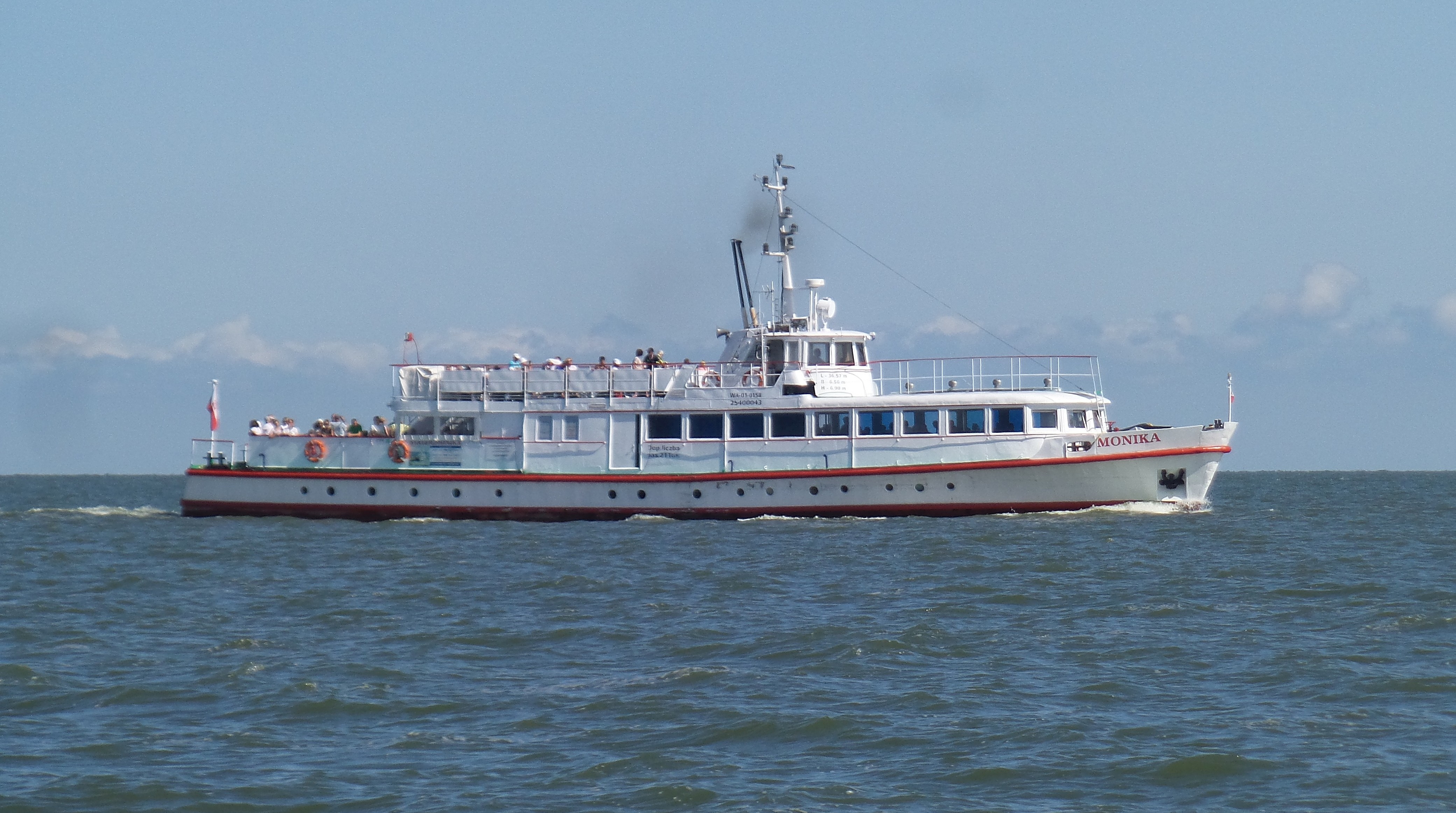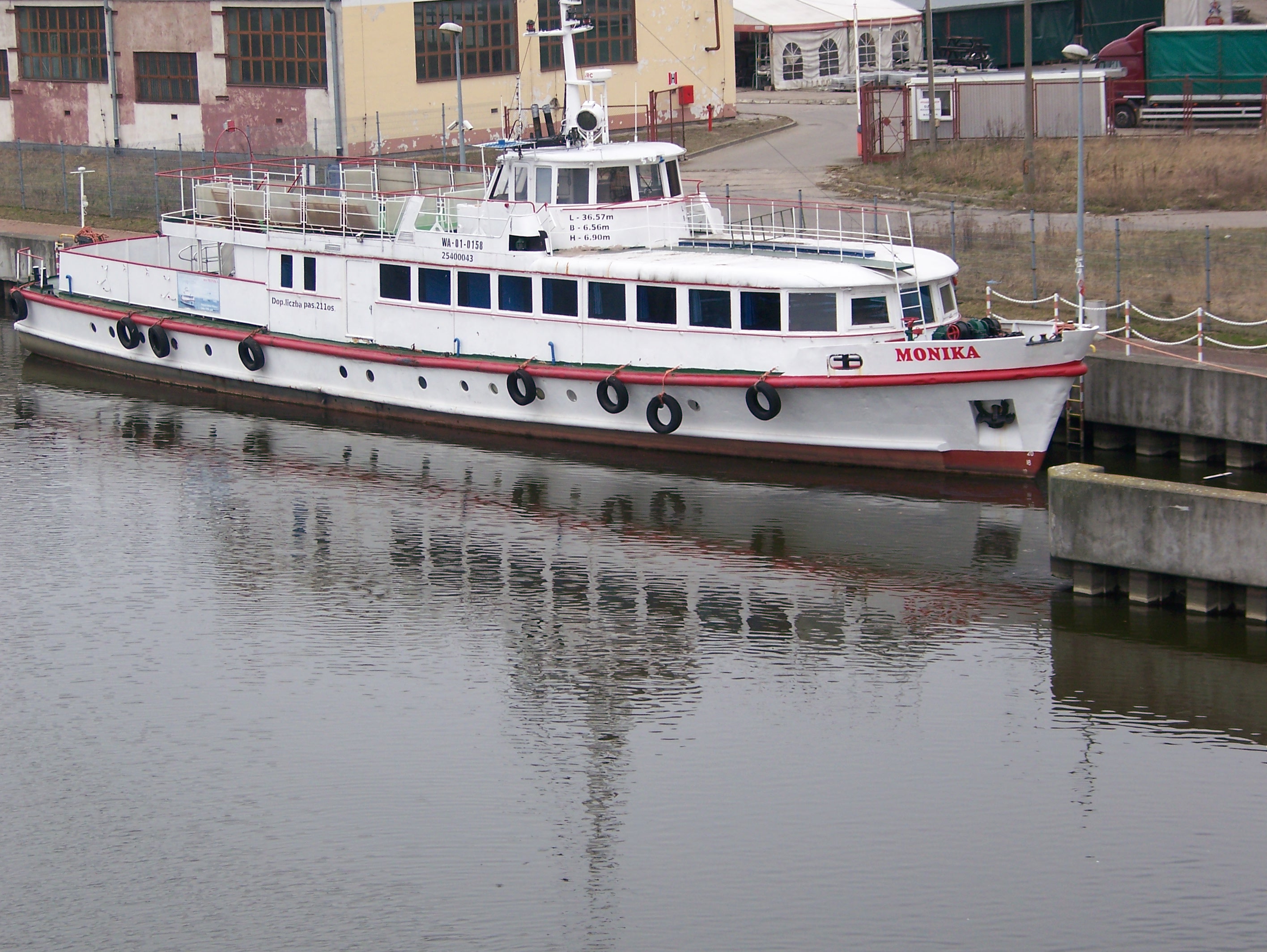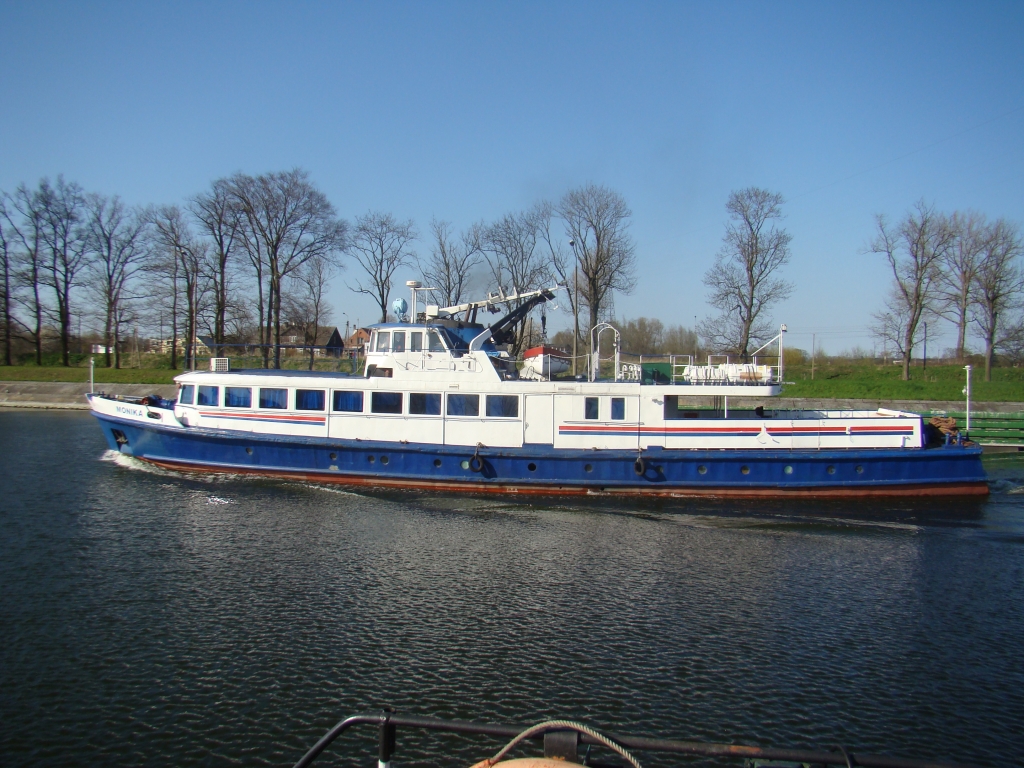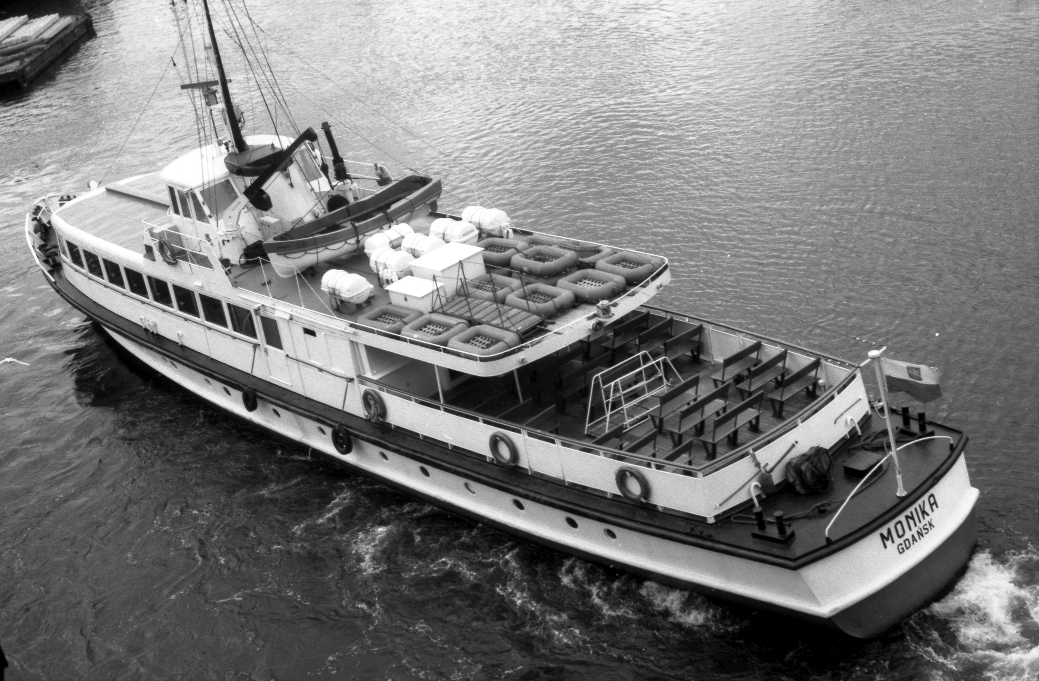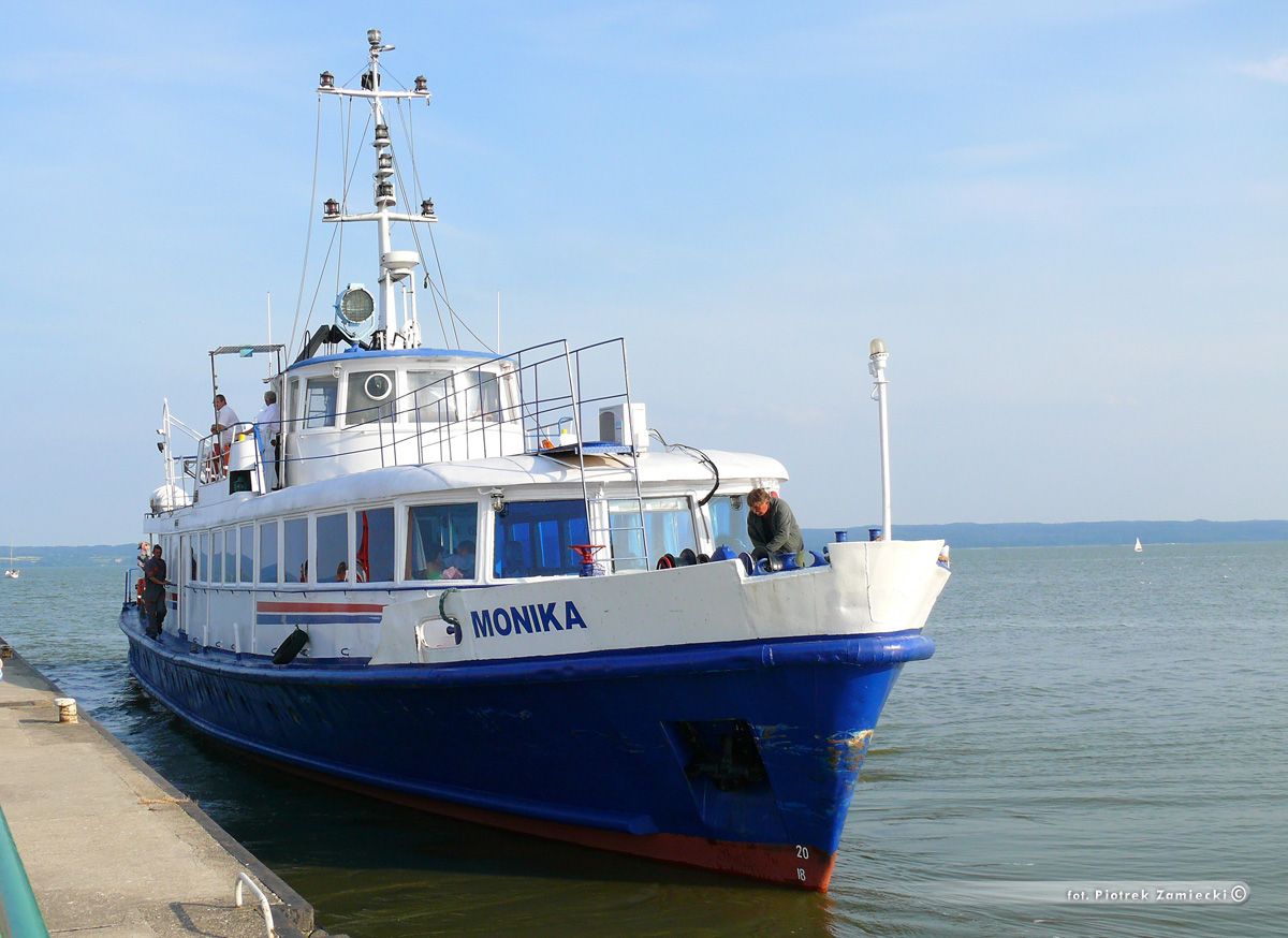 Projekt statku pasażerskiego zalewowego typu SZ-390 powstał w Biurze Projektów Taboru Morskiego w Gdańsku. Od budowanych wcześniej statków typu SZ-600 różni się on tylko mocą silników głównych. Zamontowano tu dwa silniki spalinowe wysokoprężne 4–suwowe typu 6L-160PNS produkcji CZMN Škoda, Praha o mocy 195 KM każdy przy 750 obrotach na minutę. Budowę prototypu i całej serii zlecono Gdańskiej Stoczni Rzecznej w Gdańsku. Statek przeznaczony był dla P.P. Żegluga Gdańska w Gdańsku, nazwany „MONIKA” na cześć Moniki Żeromskiej, córki pisarza Stefana Żeromskiego. Chrzest statku odbył się 15 lipca 1965 r. w Gdańsku, matką chrzestną została właśnie córka pisarza. Na pokład zabierał 243 pasażerów. Jego pojemność wynosiła 201 BRT. Eksploatowany na Zatoce Gdańskiej w oparciu o Gdańsk, Gdynię, Sopot i Hel. W 1993 r. „MONIKA” została wydzierżawiona Spółce Cywilnej „Wodnik” z Gdańska. Eksploatowana w oparciu o port gdyński. Rok później statek jest dzierżawiony przez Przedsiębiorstwo Usług Morskich Żegluga Ltd Sp. z o.o. w Gdańsku. Statek pływał na linii Gdańsk – Hel – Gdańsk. W lipcu 1996 r. wyżej wspomniana firma zostaje właścicielem statku. Natomiast od października 1996 r. właścicielem zostaje Przedsiębiorstwo Usług Morskich Żegluga Gdańska Ltd. Sp. z o.o. w Gdańsku. To tylko zabieg kosmetyczny ponieważ była to tylko zmiana nazwy armatora. W grudniu 1999 r. „MONIKA” zostaje sprzedana firmie Żegluga Pomorska Sp. z o.o. ze Szczecina. Portem macierzystym zostaje Nowe Warpno. Kadłub pomalowano na niebiesko, a sam statek po niewielkich adaptacjach był eksploatowany w rejsach wolnocłowych na trasie Altwarp – Nowe Warpno. W 2003 r. „MONIKA” zostaje sprzedana firmie P.P.H.U Orbita II Sławomir Głębocki i Sylwia Głębocka, Kołobrzeg. W 2004 r. rejsy wolnocłowe zostały zlikwidowane po wejściu Polski do Unii Europejskiej. Dwa lata później jednostkę skierowano na Zalew Wiślany w rejsach pasażerskich. Od 2009 r. właścicielem statku został firma P.H.U. Orbita z Siedlec, która rok później sprzedała „MONIKĘ” firmie Edukacja-Fracht-Budowa Partner Jerzy Kruczyński z Siedlec. Jednostka przeszła remont kapitalny, wymieniono sporą część poszycia kadłuba, utworzono drugi pokład słoneczny dla pasażerów umiejscowiony za sterówką. Pod pokładem głównym urządzono salon mogący służyć również jako sala konferencyjna dla 60 osób. Zmieniono także standard wyposażenia wnętrz. Przywrócono dawne malowanie kadłuba czyli biały zamiast niebieskiego. W 2013 r. „MONIKA” odbyła rejs czarterowy na linii Frombork – Svietłyj – Frombork. W 2017 r. kolejny remont kapitalny wynikły z odnowienia klasy PRS. Nadal w eksploatacji, stacjonuje we Fromborku. © Opracował Waldemar Danielewicz – 25.04.2025 |