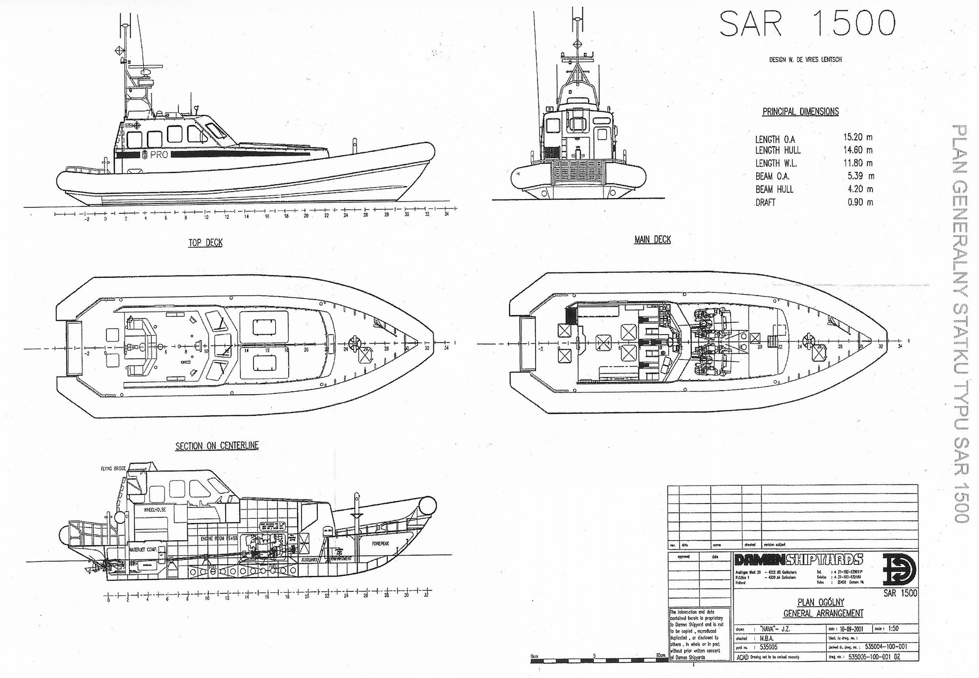 TYP STATKU: statek ratowniczy. ROK I MIEJSCE BUDOWY: 06.2002, Damen Shipyards Gdynia S.A., Gdynia. STOCZNIOWY NUMER BUDOWY: SAR1500/1507. WYMIARY: długość całkowita 15,20 m, długość rejestrowa 13,15 m, szerokość całkowita 4,19 m, wysokość boczna 1,27 m, zanurzenie 1,00 m, pojemność brutto 23,83 BRT, pojemność netto 7,15 NRT, nośność 6,60 t. SILNIKI GŁÓWNE: 2 silniki wysokoprężne typu MAN D2848LE401, 8-cylindrowe w układzie V, moc łączna 1360 KM/1000 kW, średnica cylindra 127 mm, skok tłoka 142 mm, liczba obrotów silnika 2200/min., producent: MAN A.G., Nürnberg [Niemcy]. INNE DANE: kadłub aluminiowy spawany z burtami z tkaniny gumowej, pędniki: 2 pędniki strugowodne Hamilton HJ362, prędkość 30 węzłów, załoga 3 osoby, uciąg na palu 3,5 T. ARMATOR: Morska Służba Poszukiwania i Ratownictwa w Gdyni. PORT MACIERZYSTY: Gdynia. SYGNAŁ WYWOŁAWCZY: SPLW, MMSI 261277000. NUMER PRS: 470075.