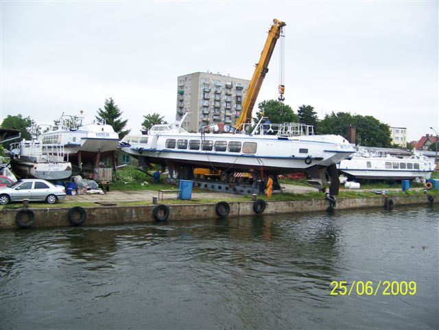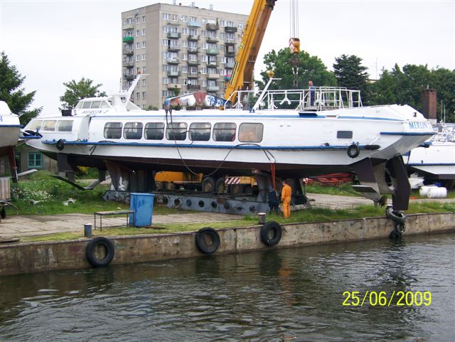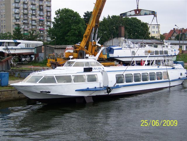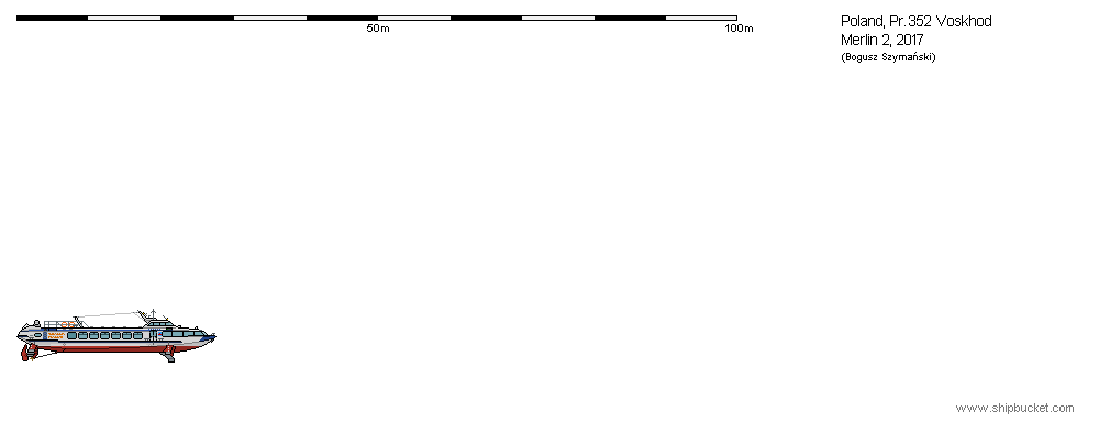 Wodolot pasażerski zaprojektowany w ówczesnym Związku Radzieckim, projekt 352, określany jako typ Woschod. Zbudowany w 1989 r. jako „WOSCHOD-68” dla Bielskoye Recznoye Parochodstwo, Ufa. W 2000 r. zakupiony przez Żeglugę Gdyńską Q-Wings Sp. z o.o. w Gdyni, nazwany „MERLIN 2”, port macierzsty Jastarnia. Eksploatowany na wodach Zatoki Gdańskiej. W 2005 r. nabyty przez Żeglugę Gdańską Sp. z o.o. w Gdańsku. Wycofany z ruchu w 2011(?) r. i wystawiony na ląd na terenie Bazy Remontowej Żeglugi Gdańskiej w Gdańsku-Stogach. Istnieje nadal. © Opracował Waldemar Danielewicz – 22.10.2025/28.03.2026 |