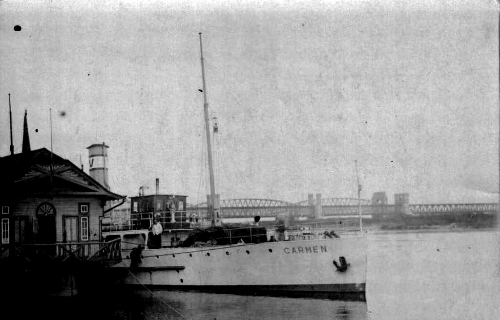 Zbudowany w Elmshorn koło Hamburga jako seryjny trałowiec przybrzeżny [Flachgehende Minensuchboot] dla niemieckiej Kaiserlische Marine, miał nosić nazwę „FM 54”. W sierpniu 1918 r. przerwano prace wyposażeniowe. Rok później okręt zwodowano dla Reichsmarineamt w Berlinie, po czym budowę ponownie wstrzymano. Nieukończony został w maju 1919 roku skreślony z listy floty i wystawiony na sprzedaż. Zakupiony przez berlińczyka B. Plage, przebudowany został na prom pasażerski w tej samej stoczni. Nazwany „FREIHEIT”, pływał jako prom portowy w Hamburgu od 1920 roku. Potem w rejsach do Danii. Podczas jednego z takich rejsów do duńskiego portu Ringkøbing wszedł na mieliznę. Ściągnięty został 20 lipca 1921 r. przy pomocy duńskiego statku „TERNEN”. Jednak brak paliwa czyli węgla spowodował, że „FREIHEIT” ponownie zdryfował na mieliznę. Po trzech dniach kutry rybackie zdjęły załogę ze statku, który został opuszczony i porzucony. W sierpniu 1921 r. „FREIHEIT” został przejęty przez duńską firmę A/S Ringkøbing Dampskibselskab z Ringkøbing za długi wobec armatora, nazwany „VESTJYDEN”, podniósł banderę duńską. Sygnał rozpoznawczy NFCG. W lutym 1925 roku zakupiony przez niemiecką firmę Seebäderdienst Memel GmbH z litewskiej Kłajpedy. Pływał pod nazwą „MEMELLAND”, ale nosił banderę litewską. Jego pojemność brutto to 177 BRT, a netto 74 NRT. Pływał po Zalewie Kurońskim. W 1927 roku trafił do Elbing [Elbląg], gdzie pod nazwą „HERMANN BALK” zatrudniony był u armatora, którym był J. Bernhard Hermann. Przebudowany na statek towarowy, pływał pod banderą niemiecką, sygnał rozpoznawczy HDNJ. Obsługiwał głównie linię do Königsberga [dz. Królewiec], ale zawijał także do Danzig [Gdańsk]. Tam też nie zagrzał długo miejsca i trzy lata później zmienia nazwę na „BRUNHILDE”, zakupił go Otto Karczinowsky właśnie z Königsberga. Przywrócono mu funkcję statku pasażerskiego, ale pozostawiono jedną ładownię do niewielkich ładunków. Pływał do Gdańska i Elbląga, ale także do portów Płw. Sambijskiego. W 1933 roku w Gdańsku statek nabyli Eliasz Leszczyński i Juliusz Dunin Holecki, obydwaj z Warszawy. W stoczni Danziger Werft w Gdańsku został przebudowany na pasażerski statek salonowy, nazwany „CARMEN”. Posiadał bardzo bogaty wystrój wnętrz. Ściany salonów wyłożone były boazerią z mahoniu, w restauracji ozdoby dodawały palmy i kryształowe plafoniery. Statek posiadał oświetlenie elektryczne i parowe ogrzewanie i był całkowicie zradiofonizowany, w salonie znajdował się fortepian. Początkowo jego portem macierzystym był Danzig [Gdańsk]. Do ruchu wszedł w 12 maja 1934 roku jako statek Polskiej Żeglugi Rzecznej „Vistula” Sp. z o.o. w Warszawie. Przejmował w Tczewie pasażerów z bocznokołowców z linii Warszawa – Tczew udających się do Gdyni. Początkowo „CARMEN” pływał przez śluzę w Einlage [Przegalina]. W 1935 roku zmienił port macierzysty na Gdynię podnosząc polską banderę, otrzymał sygnał wywoławczy SOHI. Jego pierwszym kapitanem był nieznany z imienia Sosnowski. 12 sierpnia 1935 roku wpływając do awanportu śluzy w Einlage [Przegalina] uderzył w pogłębiarkę „SCHWENTE” uszkadzając ją. W 1936 r. kapitanem statku został Jan Radecki. Podczas rejsu z Tczewa do Gdyni „CARMEN” na wysokości miejscowości Bohnsack [dz. Gdańsk-Sobieszewo] wszedł na mieliznę podczas gwałtownej burzy, która ograniczyła widoczność. Po kilku godzinach został ściągnięty przez przybyłe z Gdańska dwa holowniki. W dniu 8 stycznia 1937 roku w czasie rejsu z Gdyni do Tczewa wpływając na Martwą Wisłę w porcie gdańskim uderzył w barkę „ZOFIA”. Natomiast w czerwcu 1937 r. w Gdyni doszło do kolizji statku z nabrzeżem w wyniku czego jednostka doznała uszkodzeń. Od lipca 1937 r. „CARMEN” przeszedł remont w Stoczni A & W. Wojan w Gdańsku. W tym okresie na linii Tczew – Gdynia – Tczew zastąpił go gdański statek „META” Gustava Pohlmanna. W październiku 1937 r. „CARMEN” zaliczyła kolejną kolizję – jej ofiarami stały się dwie motorówki „B I” i „B II”, obie uległy sporym uszkodzeniom. W połowie 1938 roku na skutek utrudnień stawianych przez Senat Wolnego Miasta Gdańska w zawijaniu do tego portu, a także przepływania przez niego, „CARMEN” pływała do Gdyni przez ujście Wisły pod Schiewenhorst [Świbno], kapitanem był wówczas Antoni Kleszczewski. Zdarzało się na krótko przed wybuchem wojny we wrześniu 1939 roku, że „CARMEN” była często asekurowana przez trałowiec Marynarki Wojennej. Ostatni sezon 1939 roku rozpoczęto 17 maja, a zakończono w połowie sierpnia 1939 r. Pogmatwane są losy tego statku w przeddzień wybuchu wojny. Według wersji podawanej przez Jerzego Micińskiego, a otrzymanej od starszego mechanika statku Stanisława Małeckiego, 31 sierpnia w godzinach wieczornych otrzymano od dyrekcji „Vistuli” z Warszawy polecenie samozatopienia statku poprzez odkręcenie zaworów dennych, co też podobno uczyniono w basenie portowym w Tczewie. Według natomiast informacji ustnej otrzymanej od córki ostatniego kapitana statku, został pod koniec sierpnia 1939 r. zmobilizowany przez Marynarkę Wojenną i pozostawał w Gdyni. Po wybuchu wojny miał być używany do transportu rezerwistów na Hel. Tam też po 14 września został odstawiony, wygaszono kotły załogę zredukowano do minimum. W dniu 2 października 1939 roku właśnie na pokładzie statku przyszła na świat córka kapitana, która otrzymała imię Carmen. Jako dowód przedstawiała mi zaświadczenie o urodzeniu podpisane przez kmdr. Włodzimierza Steyera. Po kapitulacji Helu statek został przejęty przez niemiecki Kommissärische Verwalter der Haupttreuhandstelle Ost für die Binneschiffahrt des Weichselstromgebietes, Danzig i sprowadzony do Gdańska. Zakupiony przez armatora Hermanna Götza z Cra