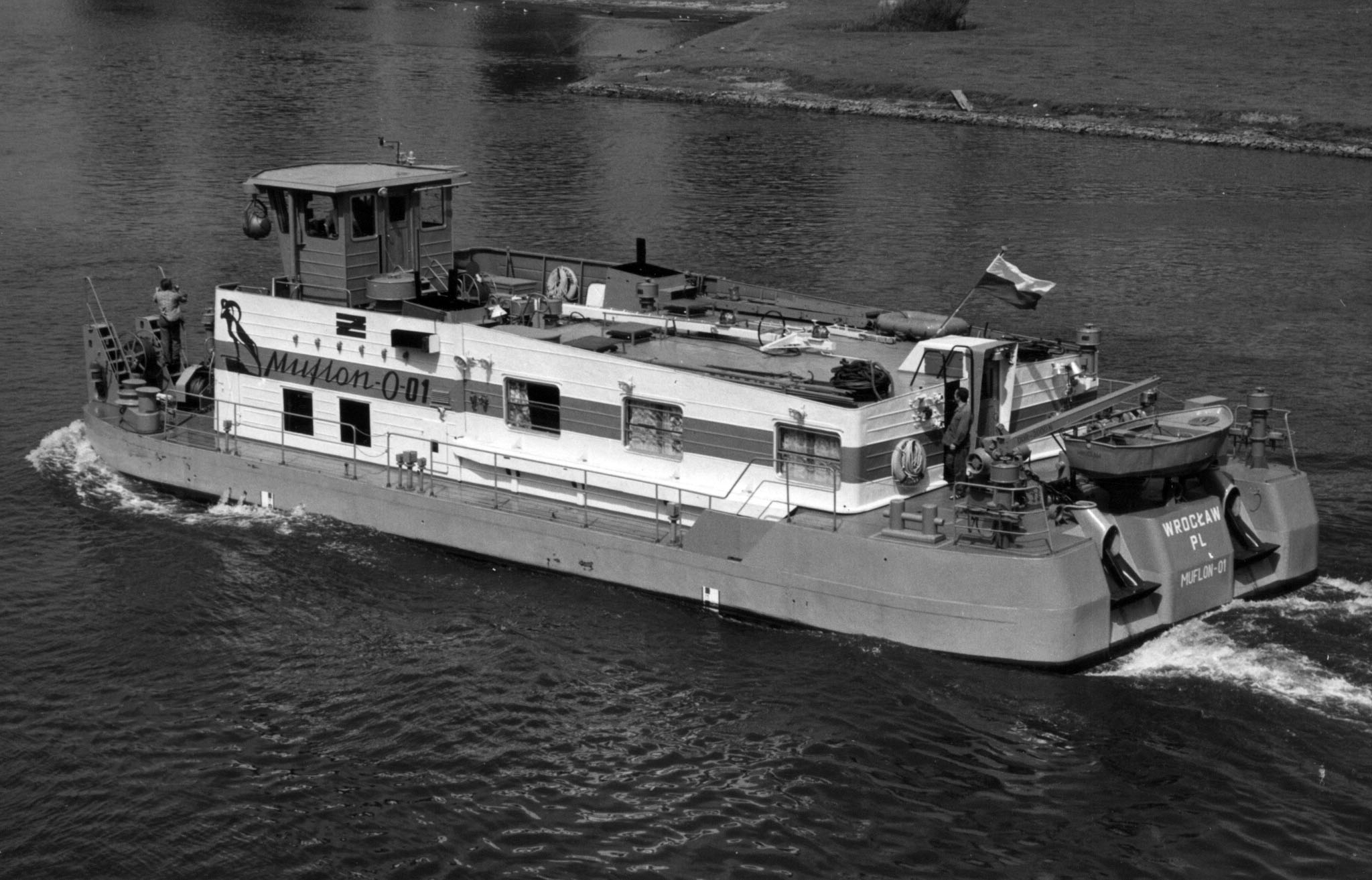 Pod koniec lat siedemdziesiątych XX w. Centrum Badawczo-Projektowe Żeglugi Śródlądowej we Wrocławiu zgodnie z umową nr 2999 otrzymało zlecenie na zaprojektowanie pchacza rzecznego o dość silnej mocy napędu głównego przeznaczonego do całodobowej obsługi barek pchanych pojedynczych lub w zestawach jednakowych, bądź różnych barek. Projekt początkowo otrzymał nazwę „Muflon”, którą zmieniono na „Bawół-I”. Natomiast nazwę „Muflon” przeniesiono na budowane jednostki. Budowę prototypu zlecono Wrocławskiej Stoczni Rzecznej we Wrocławiu, gdzie otrzymały numer budowy B-583. Stocznia ta budowała jednostki dla potrzeb ówczesnej Żeglugi na Odrze we Wrocławiu, natomiast na eksport do Czechosłowacji "Muflony" budowane były w Tczewskiej Stoczni Rzecznej w Tczewie. Pchacze typu "Bawół-I" były jak na ówczesne czasy nowoczesnymi jednostkami, zarówno pod względem eksploatacyjnym, jak i warunkach socjalnych stworzonych dla załóg. Pchacz typu „Bawół-I” zbudowany w 1978 r. we Wrocławskiej Stoczni Rzecznej we Wrocławiu dla P.P. Żegluga na Odrze we Wrocławiu, nazwany „MUFLON-O-01”. Port macierzysty Wrocław. Od 1992 r. w Odratrans S.A. we Wrocławiu. Od 2012 r. w OT Logistisc S.A. Istniał jeszcze w sierpniu 2025 r. © Opracował Waldemar Danielewicz – 24.05.2025 |